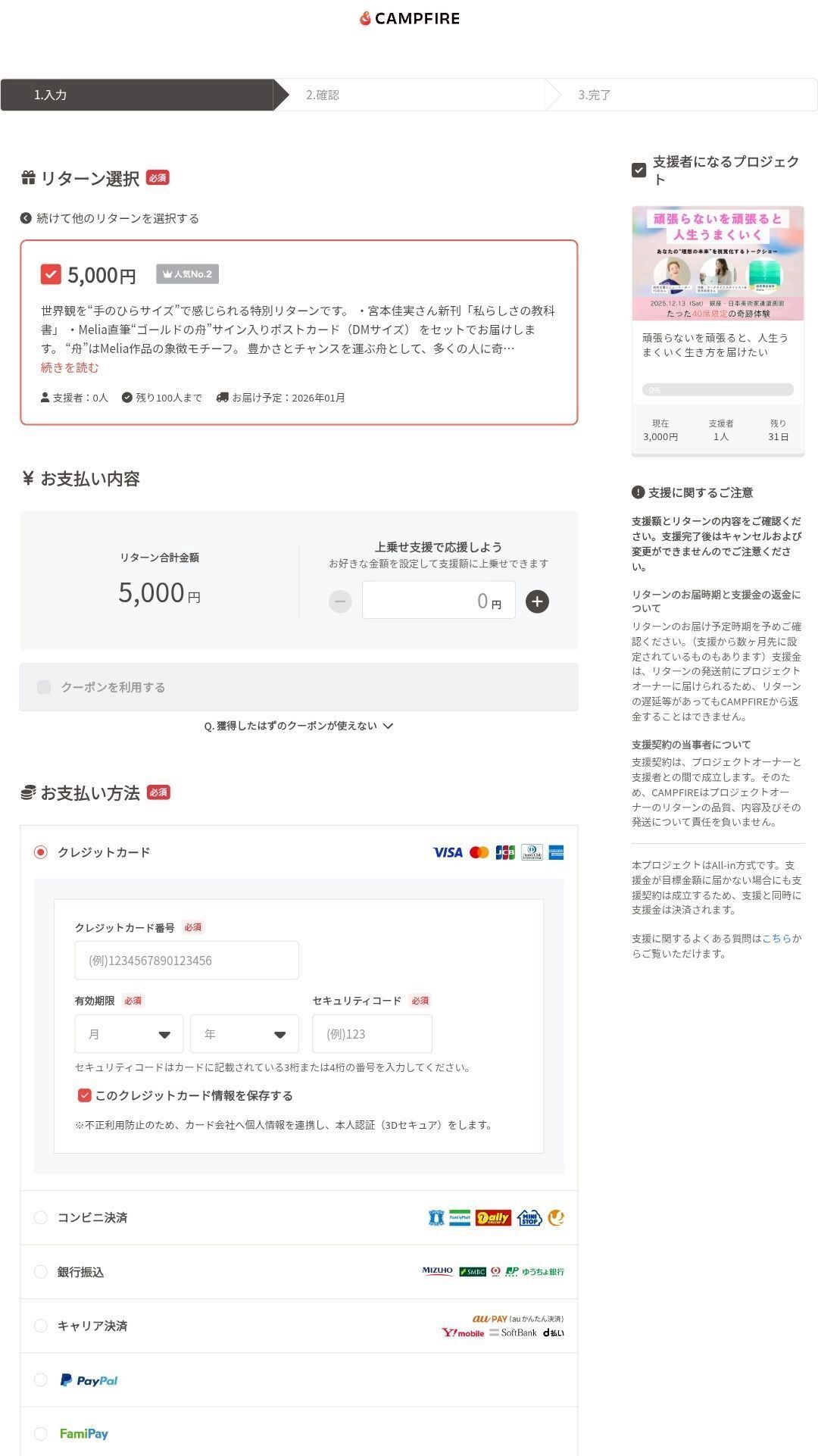【確認画面へ】を押したのにプロジェクトページに戻ったら…セッションの有効期限が切れた(入力の時間切れになった)可能性があります。お手数ですがもう一度【プロジェクトを支援する】ボタンを押して、支援に必要な情報を入力してください。