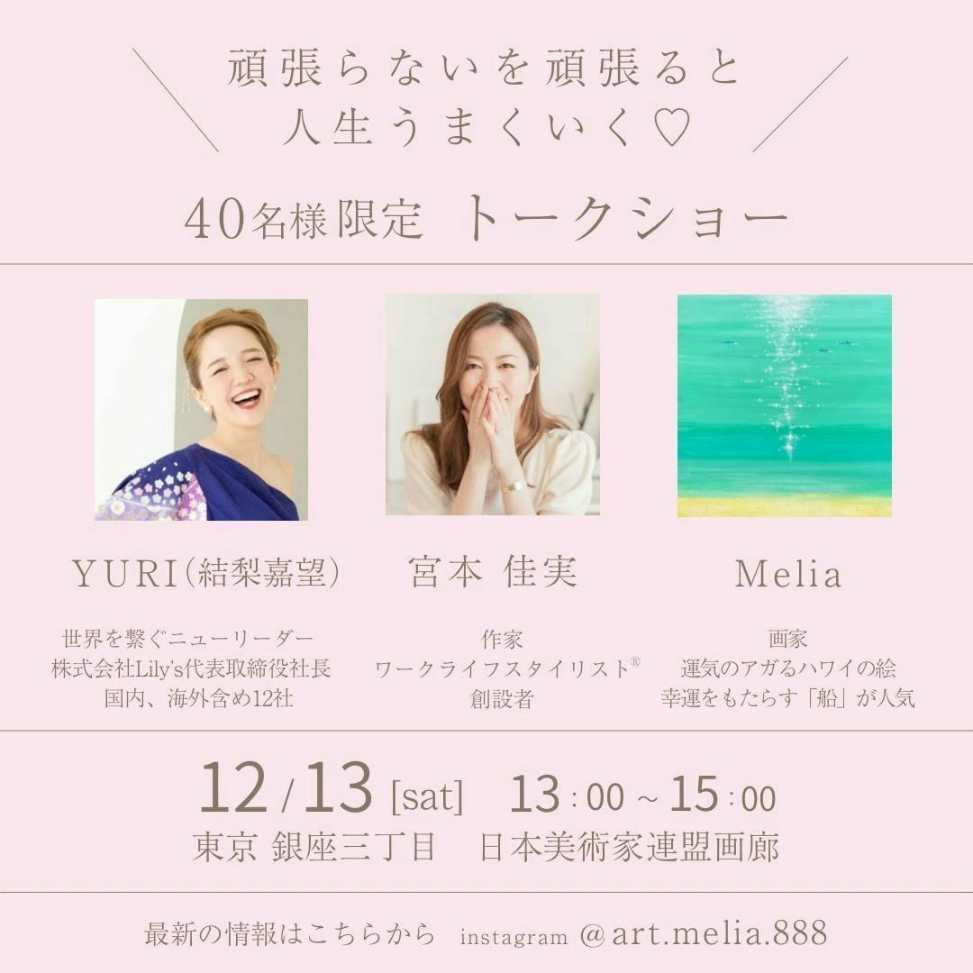 「がんばり続けるほど、うまくいかない」そんな壁にぶつかったこと、ありませんか? 本プロジェクトは、起業家3人(宮本佳実さん/YURIさん/画家Melia)のリアルな実体験から、 “頑張らないを頑張る”生き方を体感し、未来を“最短”で開くための少人数イベントです。 会場は銀座の日本美術家連盟画廊