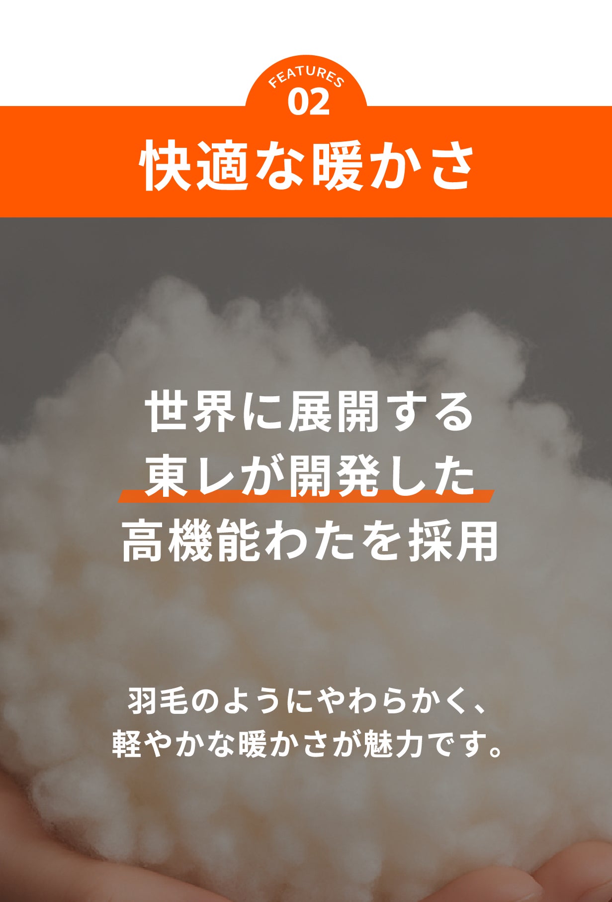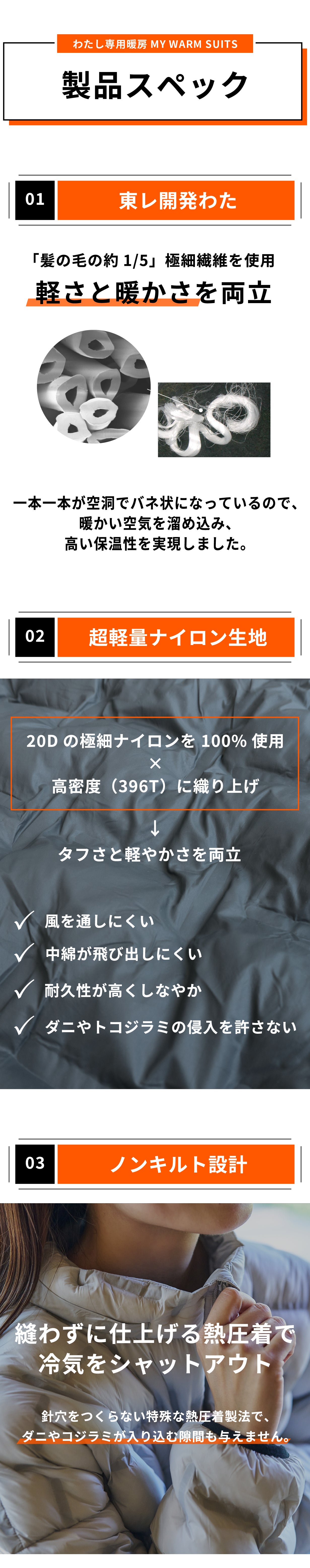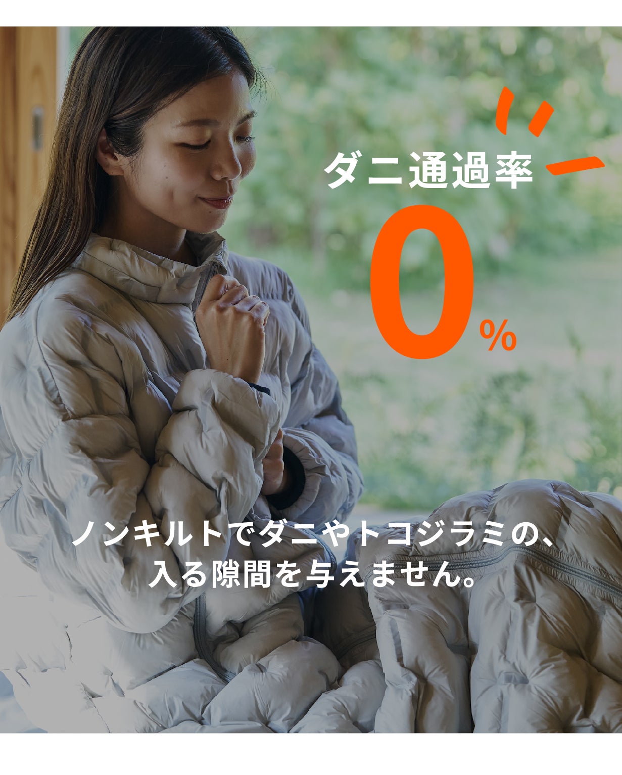 冷気の通り道になる縫い目をなくしたノンキルト仕様。寒い日も心地よい暖かさであなたを包み込みます。