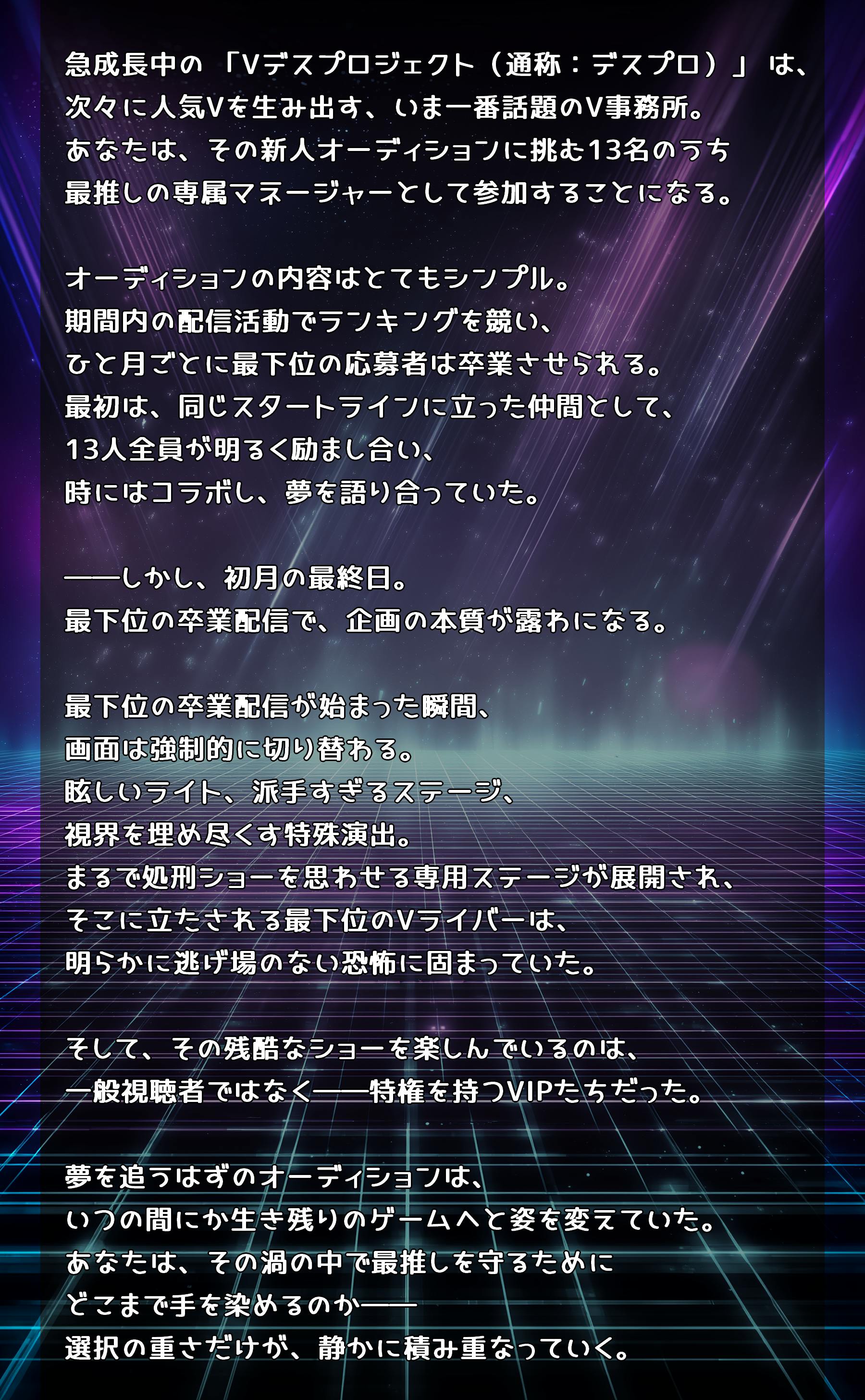 『Vデスゲーム』は、13人のVライバーが毎月のランキング最下位になるたびに"卒業"していく、デスゲーム形式のADVです。プレイヤーがマネージャーとして行った選択が、推しがどんな結末にたどり着くのか、その後の物語の大きな展開に直結します。
