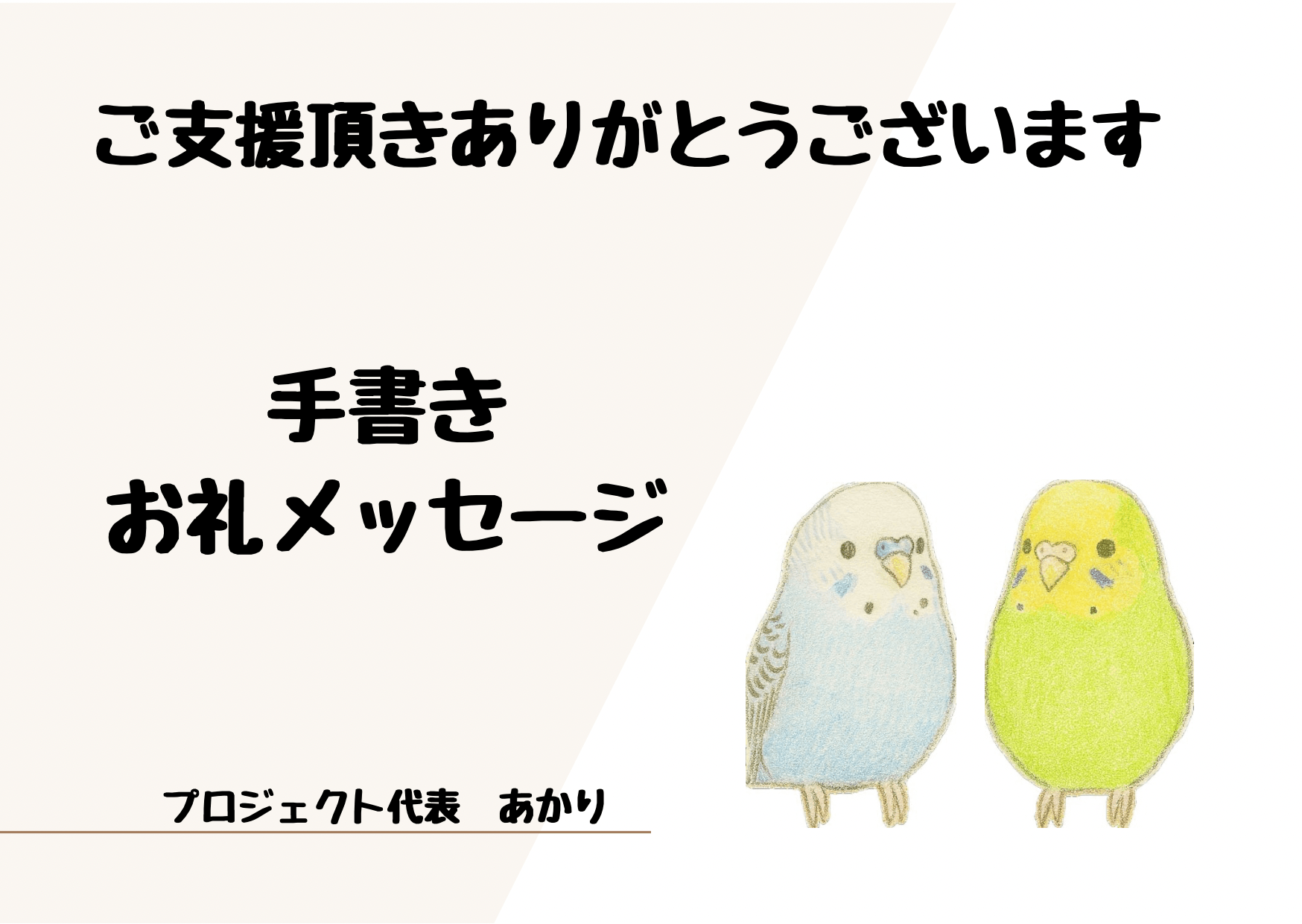 飼っているインコをモチーフにした、今回のプロジェクト限定デザイン。やさしい雰囲気のイラストと、手書きのひとことメッセージを添えてお届けします。