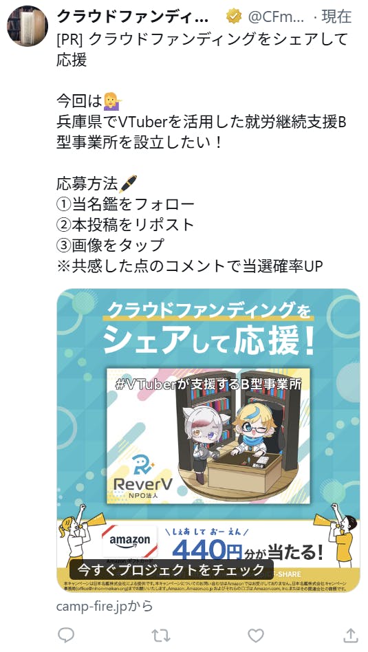 条件を満たすとAmazonギフトカードが当たるかも?なのでぜひ応援、シェアお願いします!