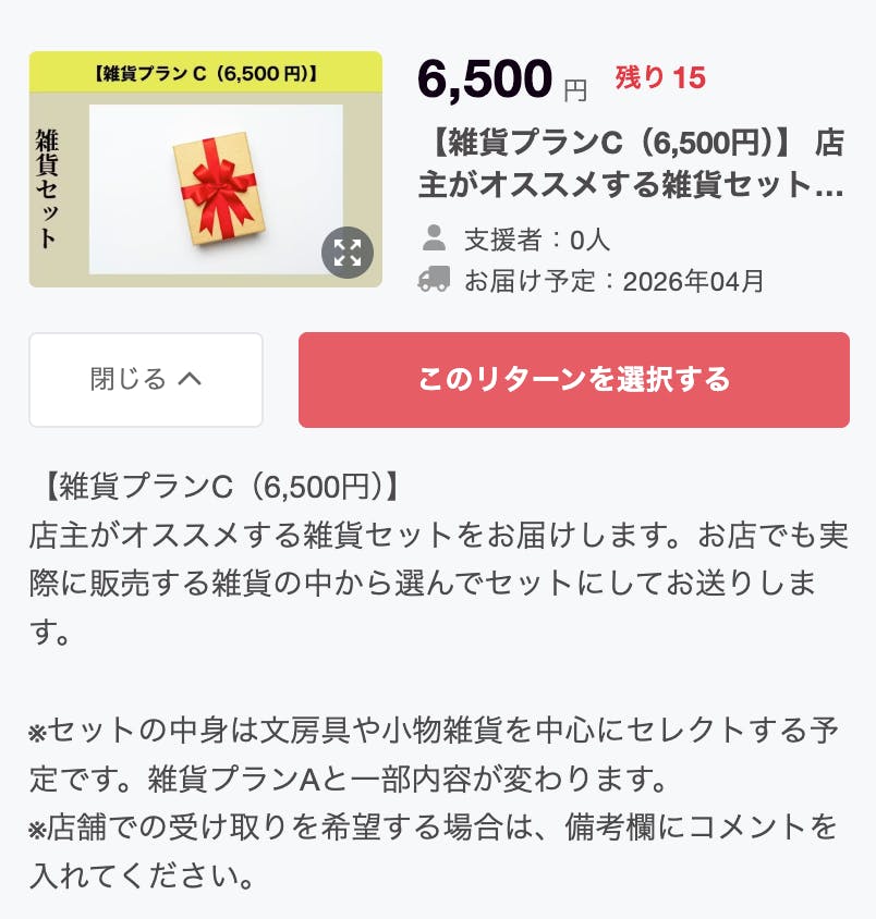 まずは、人気で売り切れとなった雑貨セットと少し内容を変えて追加した【雑貨プランC(6,500円)】。