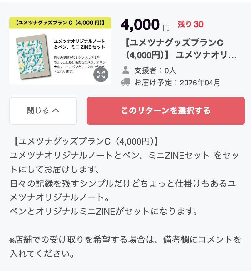 もう一つは、オリジナルグッズとして制作中のノートに、ペンと限定ミニZINEをつけた【ユメツナグッズプランC(4,000円)】。