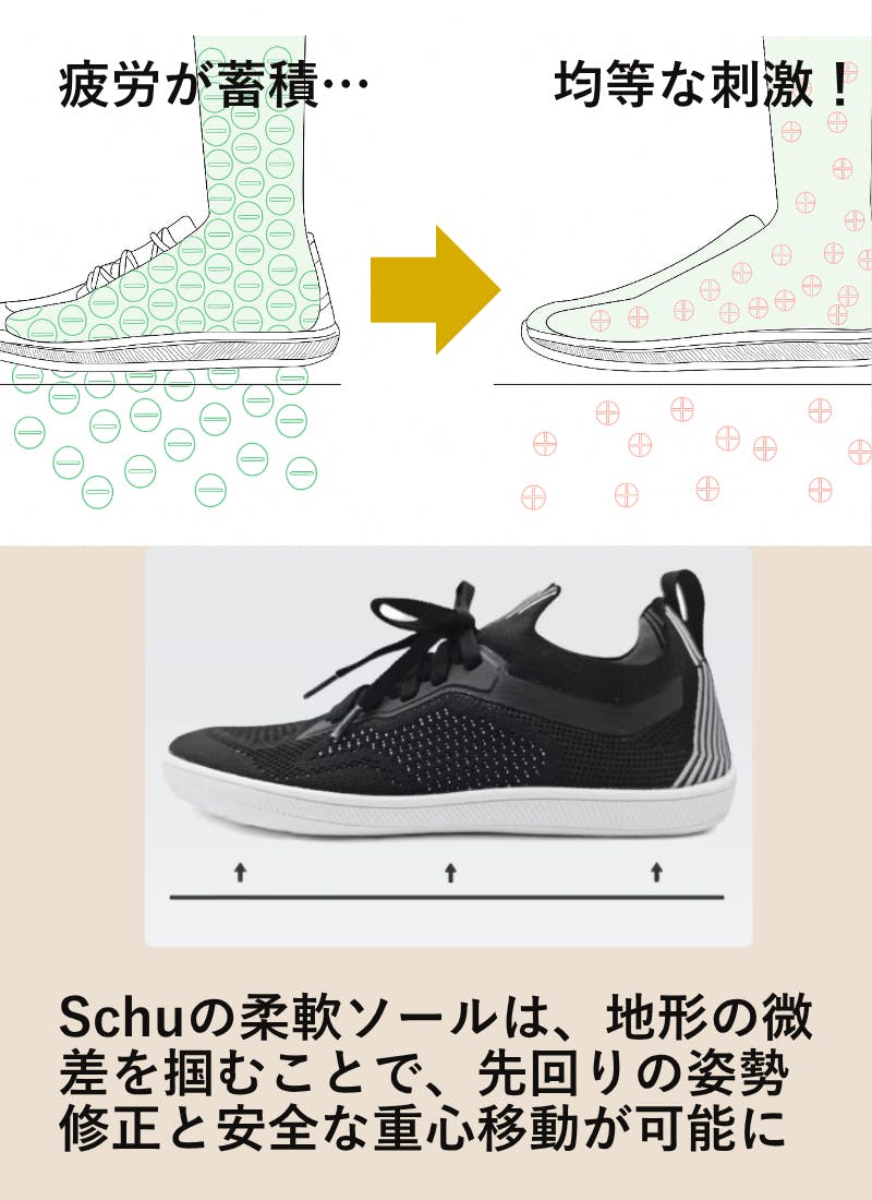 足裏には約20万個の感覚受容器が集まり、温度・圧力・振動・傾きなどを瞬時に検知します。Schuのミニマルソールは、このセンサー群に“ほどよい刺激”を与え、眠っていた感覚を目覚めさせます。守りすぎず、攻めすぎない厚みと柔軟性が、日常の一歩一歩を高精度な入力信号に変換します。