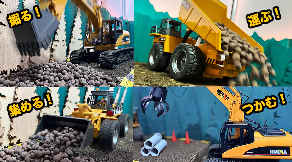 画面の向こうで動くミニ重機を、ジョイスティックやスマホで直感的に操作できます。遊びながら、遠隔で物を動かす感覚や操作の手応えを体験でき、未来の重機パイロットの気分も味わえます。