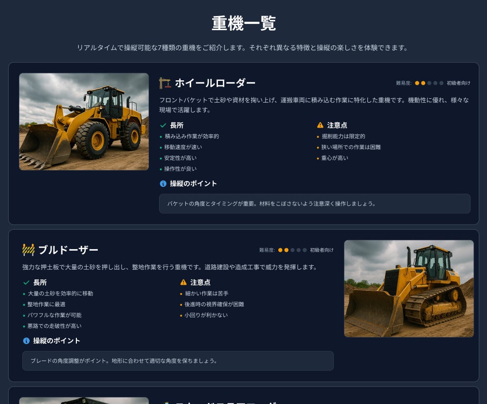 開発中サイトの重機紹介画面(仮)