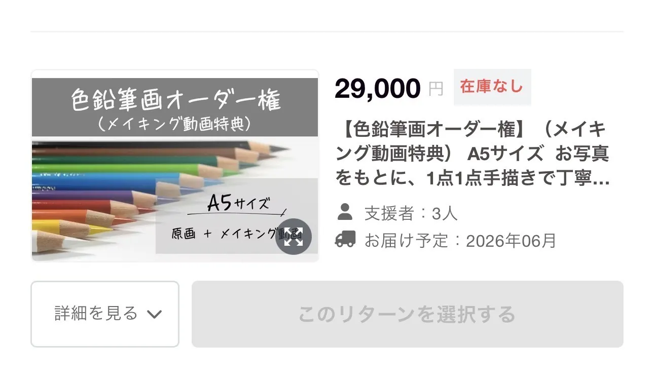 2026/04/07 16:29ありがたいことに「色鉛筆画オーダー権(A5サイズ)」限定3枠が埋まりました!ご支援いただいた皆さま本当にありがとうございます。このプロジェクトと今の活動が少しずつですが確実に広がっていることを実感しています。他のリターンも、数に限りがあります。「大切な想いをカタチに残したい」方へぜひ一度プロジェクトページをご覧ください。プロジェクト詳細はこちらから もっと見る