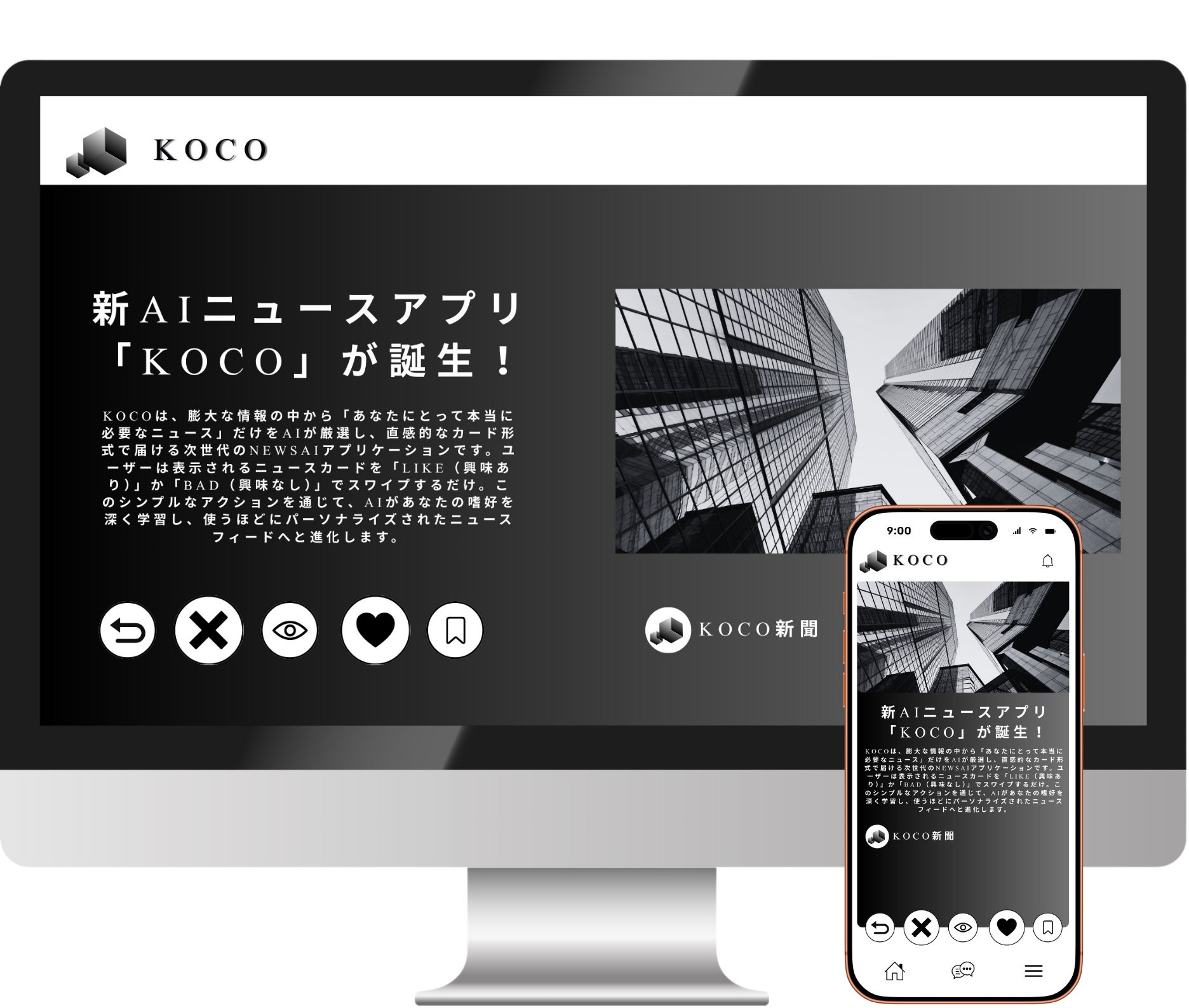 私たちは「ニュースに振り回されず、行動と成果につながる情報だけに出会える世界」をつくる、というミッションのもと、このKOCOというニュースアプリケーションを開発しています。