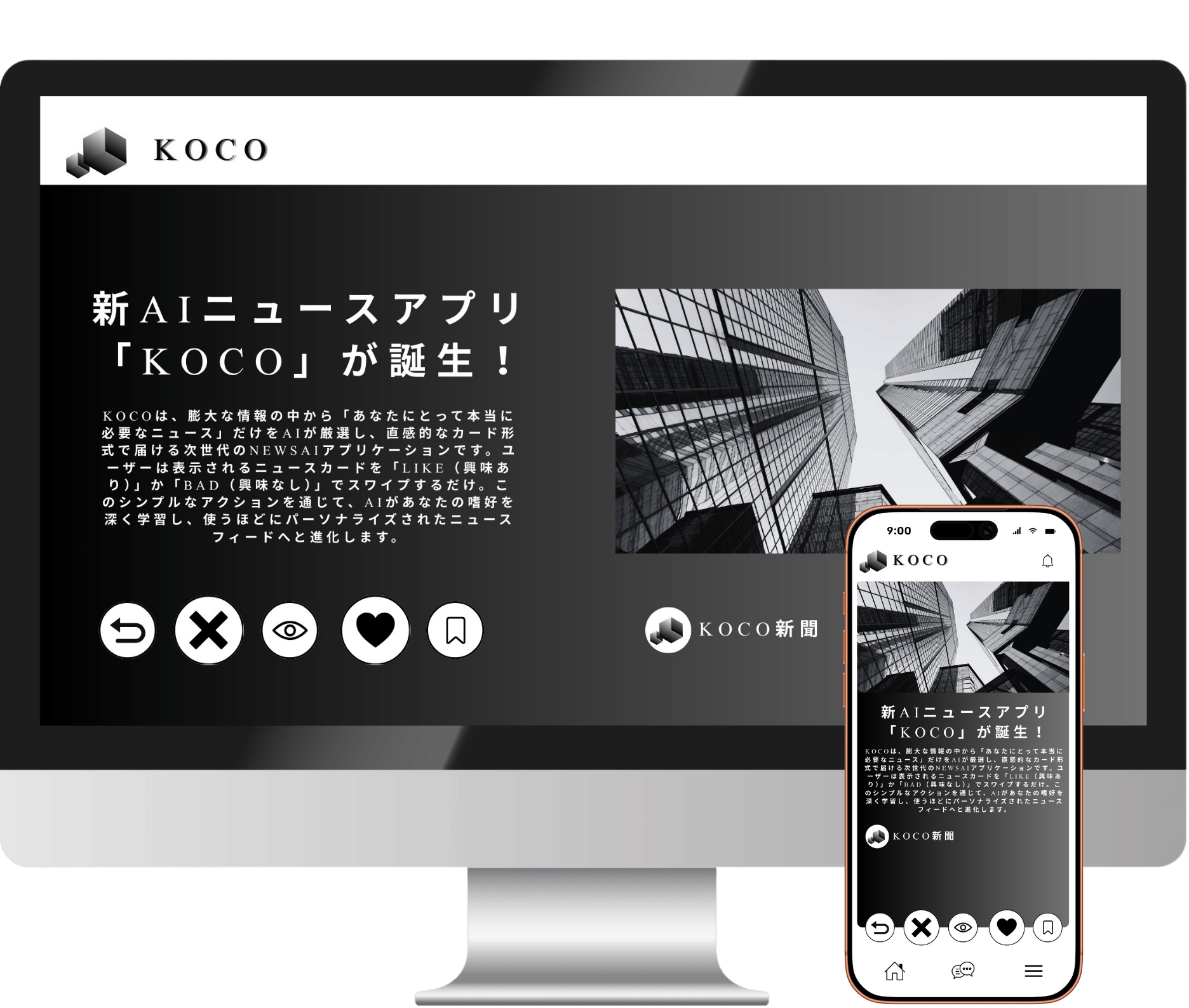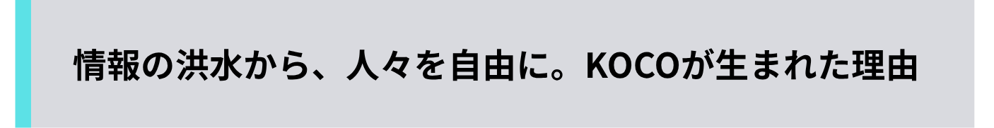 私たちは「ニュースに振り回されず、行動と成果につながる情報だけに出会える世界」をつくる、というミッションのもと、このKOCOというニュースアプリケーションを開発しています。