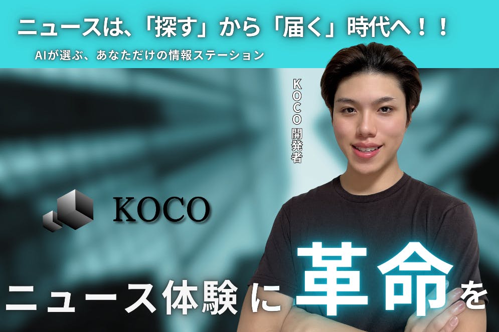 初めまして。AIニュースアプリケーション「KOCO」の開発をしている下保 沢真(かほ たくま)と申します。2005年生まれの現在20歳です。