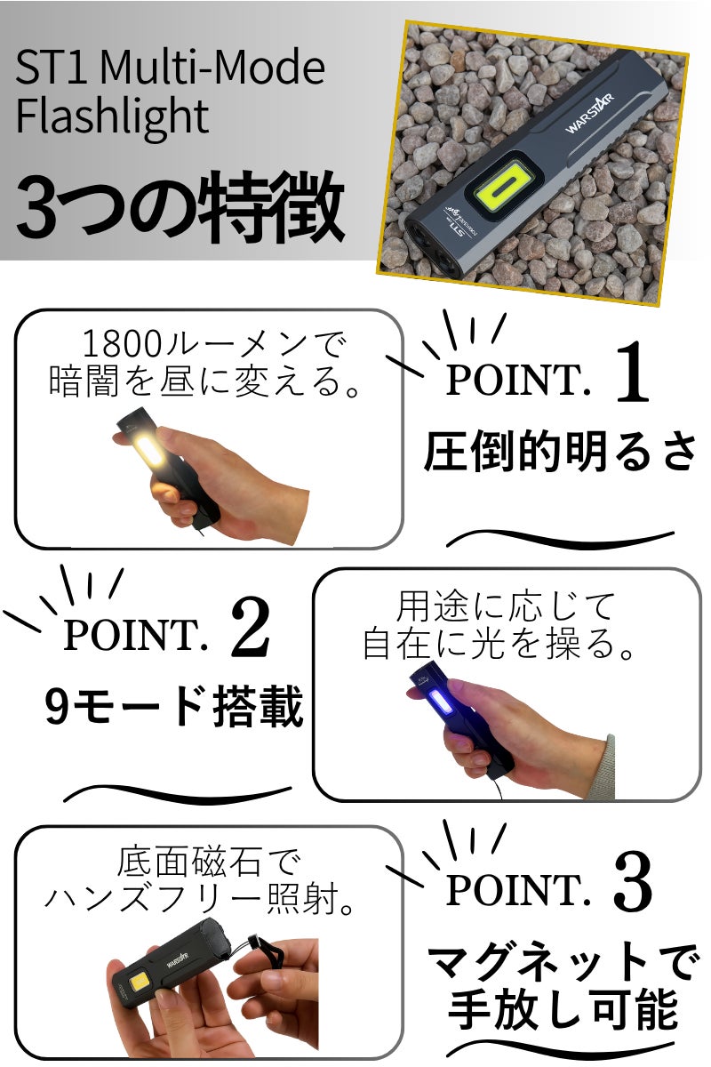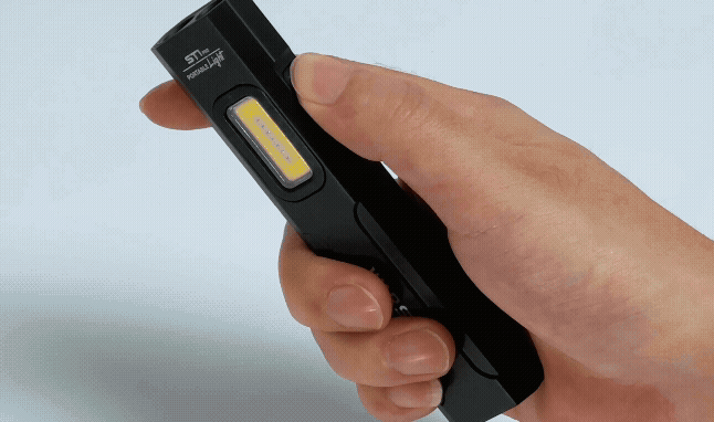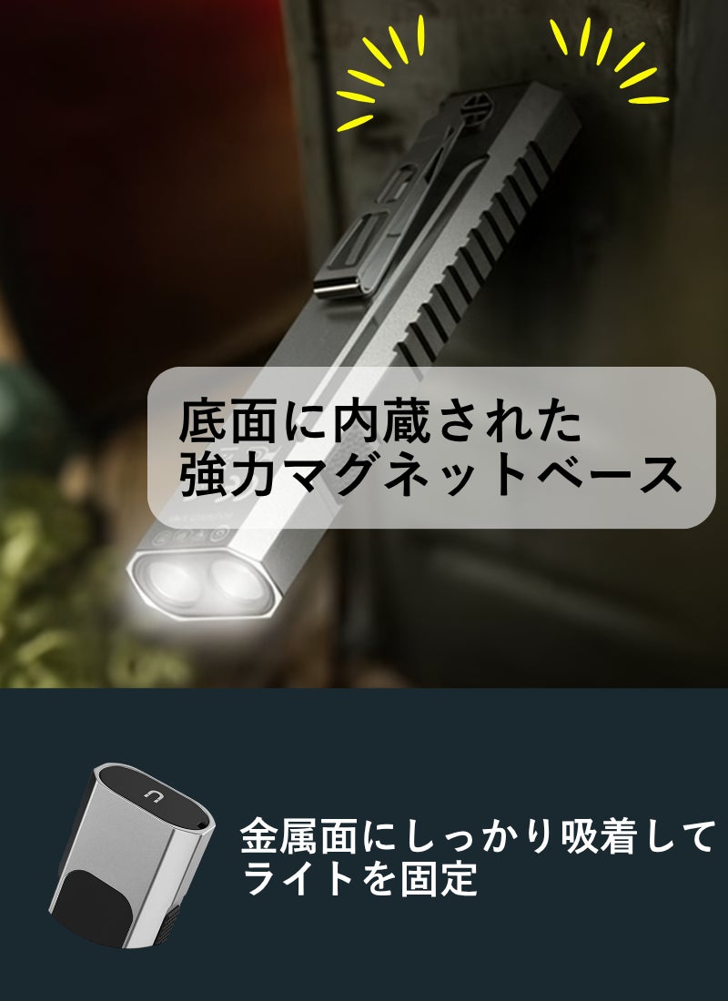 ST1の最大の特長のひとつが、底面に内蔵された強力マグネットベース。金属面にしっかり吸着し、ライトを固定したまま両手を自由に使えるため、作業効率が大幅に向上します。