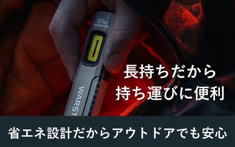 持ち歩きを妨げないコンパクト設計(29×16×126mm)。ツールボックス・車内・バックパックにもすっきり収納。日常携行から防災備えまで、常にそばに置けるライトです。