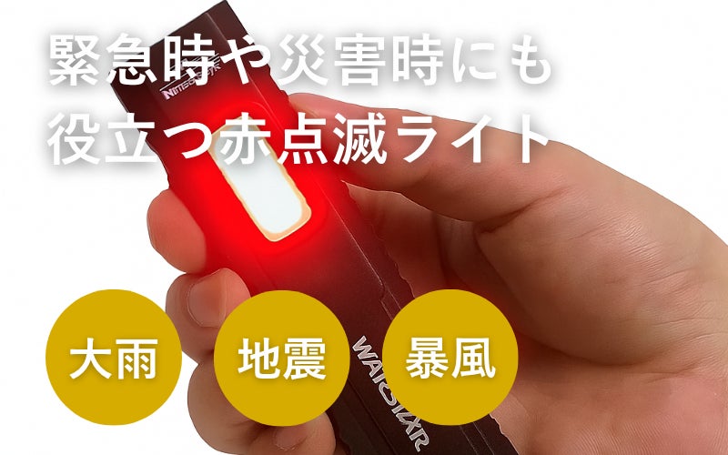 緊急合図や注意喚起に役立つストロボ(点滅)モードをトップライトと赤色サイドライトの双方に搭載。遠目でも視認されやすく、夜間のロードサイド作業やキャンプ場での位置知らせ、災害時のシグナルとして力を発揮します。