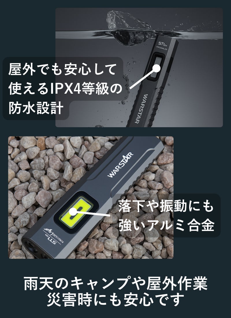 屋外でも安心して使えるIPX4等級の防水設計。あらゆる方向からの水しぶきに耐えるため、雨天のキャンプや屋外作業、災害時にも安心です。