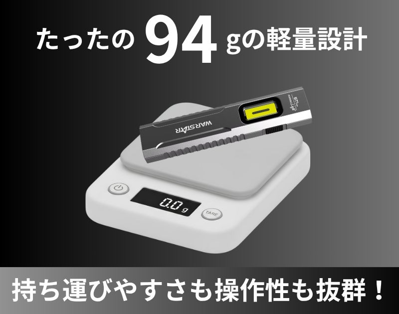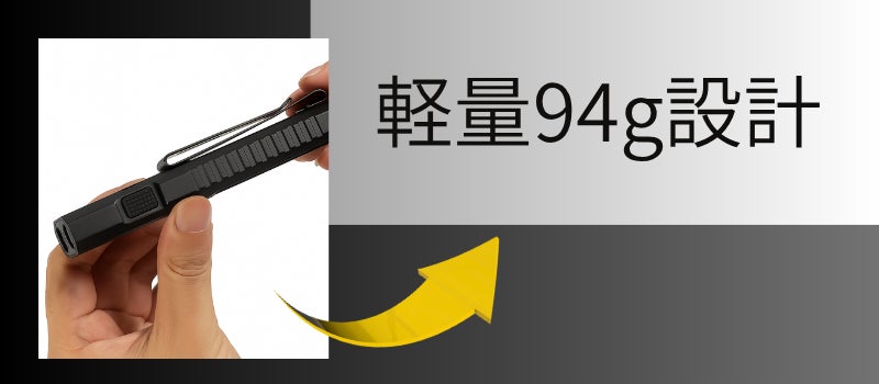 驚くほど軽く、**わずか94g(本体重量)**のスリム設計。アルミ合金の堅牢ボディを採用しつつも、持ち運びやすさを徹底的に追求しました。