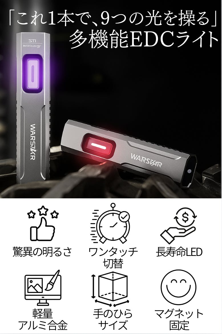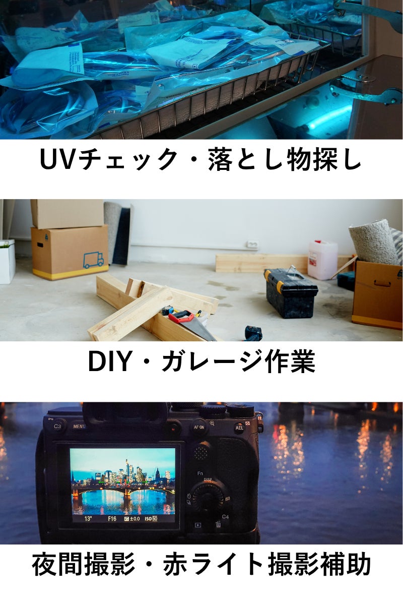 1本でUV(365nm)・赤色・白色(ウォーム含む)の3種を網羅。サイドライトのUVライトは油汚れ・リーク・蛍光マーキング・紙幣のセキュリティチェックなど“見えない情報”をあぶり出し、赤色ライトは暗順応(夜目)を保ちながら手元作業や地図確認に最適。メインの**白色(トップライト)**は広範囲を明るくクリアに照らし、屋外の移動から整備・DIYまでオールラウンドに活躍します。