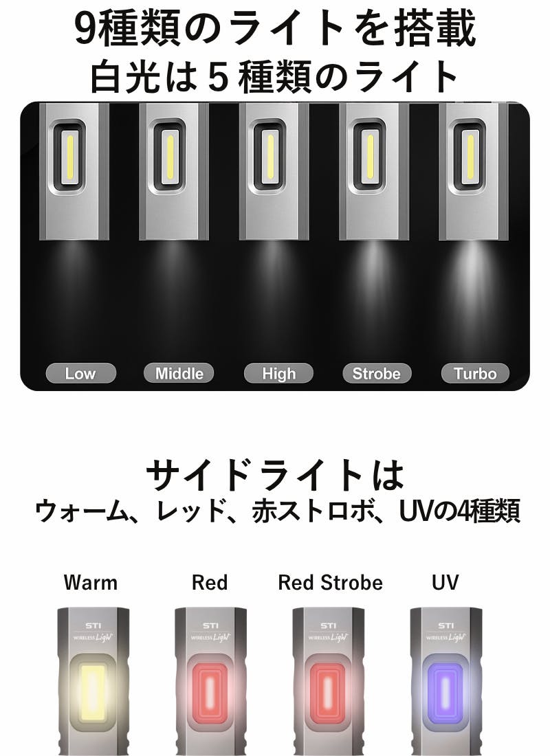 トップライト:Low/Middle/High/Turbo/Strobeサイドライト:UV/赤ライト/ウォームライト/赤ストロボ→ 状況に応じて最適な光を瞬時に選択可能。夜間作業から緊急信号まで、幅広く対応します。