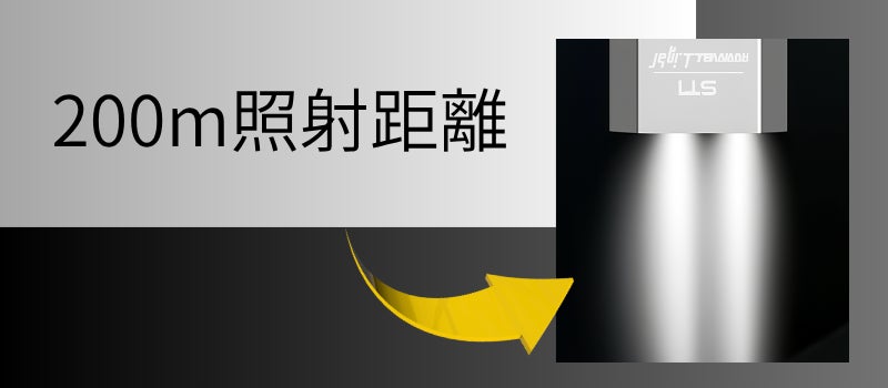 最大約200m先まで届くビームで、遠方の状況把握や足元〜前方の同時確認がスムーズ。