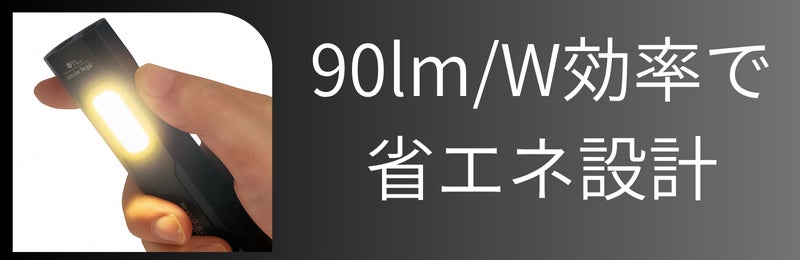 コンパクトながら、1000mAhリチウムバッテリーを内蔵。1回の充電で最大約8.5時間の連続使用が可能です。高効率90lm/WのLED設計により、明るさと省エネを両立しています