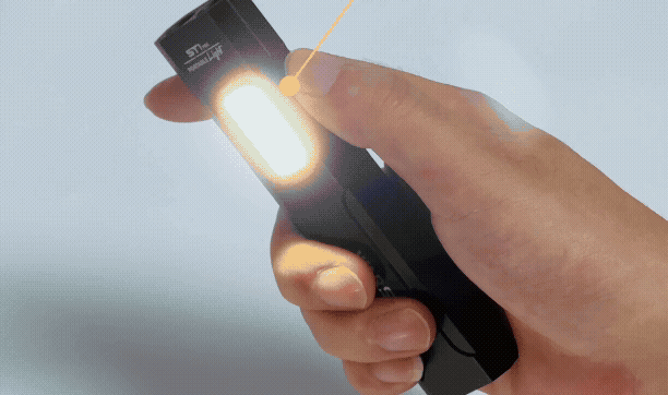 手のひらサイズながら、最大1800ルーメンの圧倒的な光量を実現。暗所での細かな作業から屋外の探索まで、トップライトのTurbo/High/Middle/Low/Strobeモードを使い分けて、状況に最適な明るさを即座に選べます。