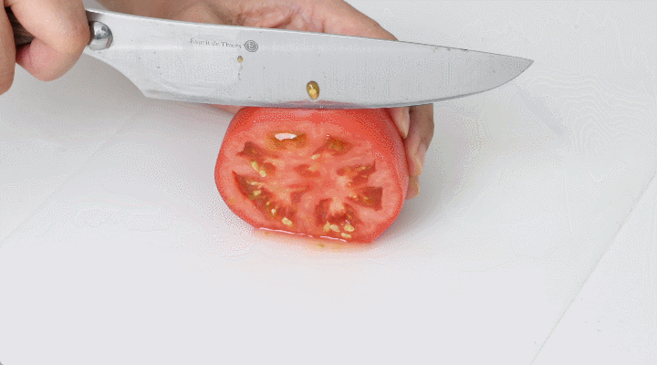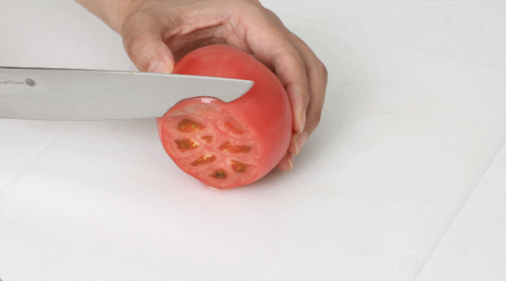 鈍った包丁では厚くしかトマトをスライスできませんが、【TOGIMEISTER 刃之匠】で研ぎ直した包丁は薄くスライスしやすくなります。