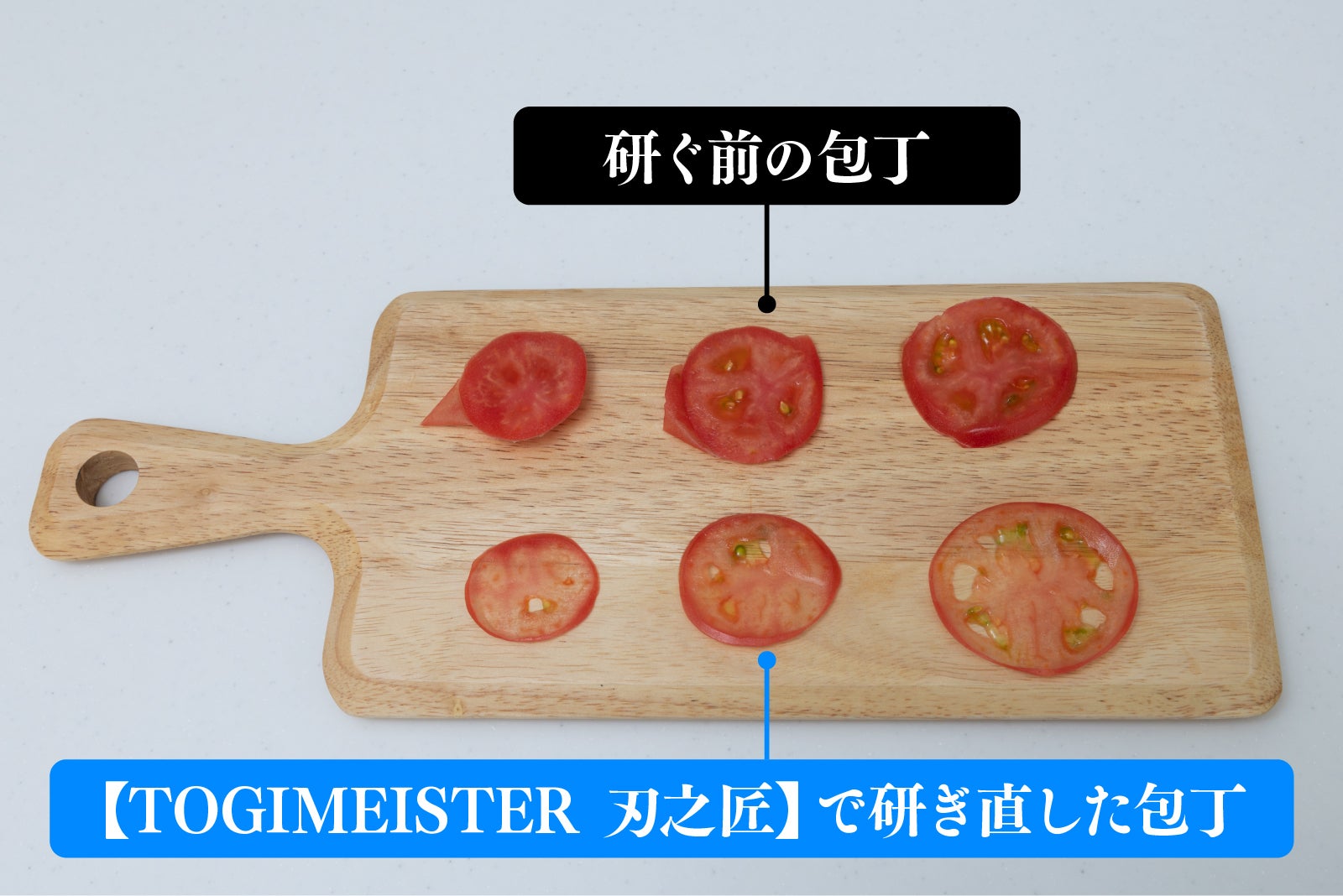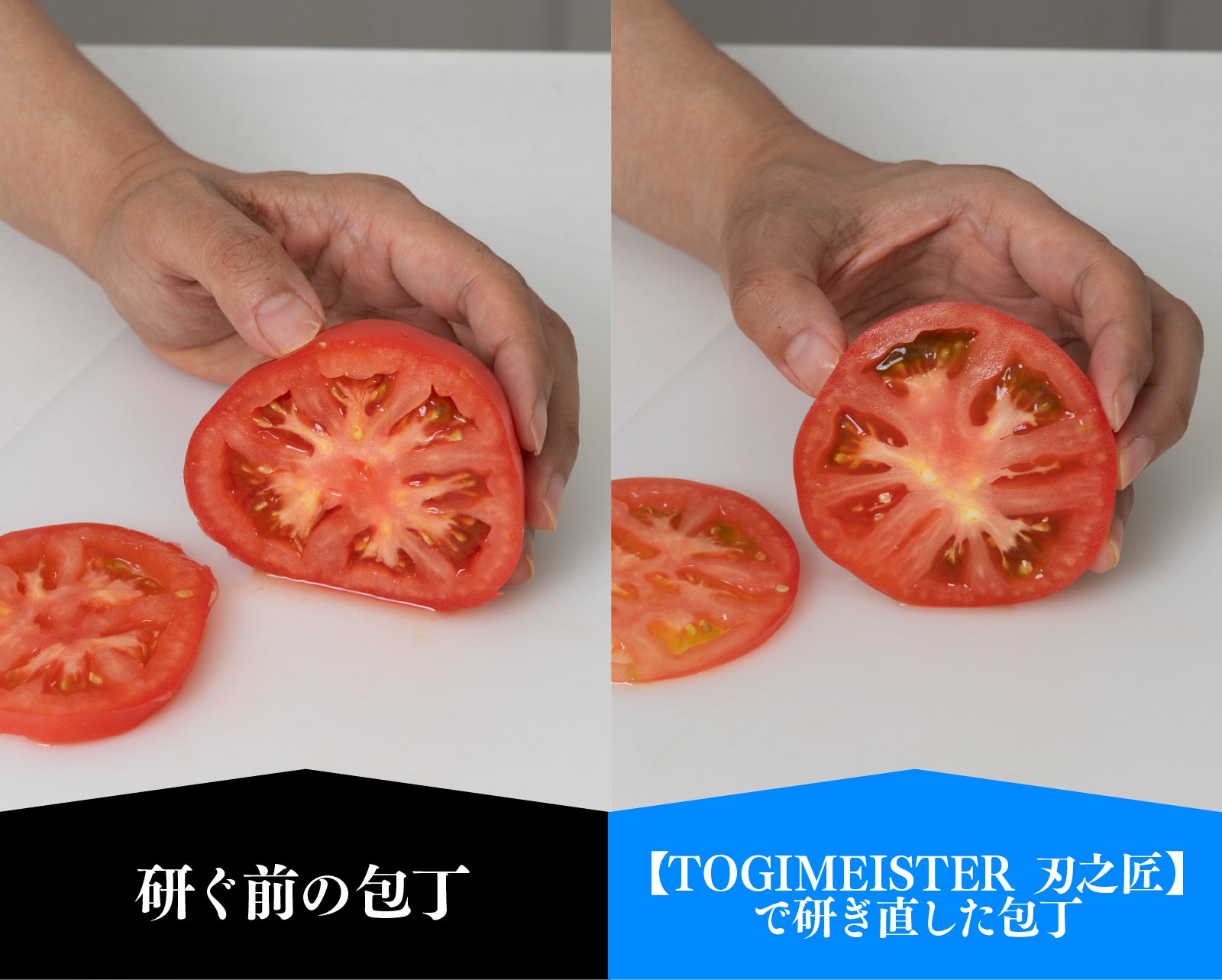 研ぐ前の包丁は刃を充てただけでトマトが潰れ、刃が入りにくいのに対し、【TOGIMEISTER 刃之匠】で研ぎ直した包丁は刃がスーッと入ります。