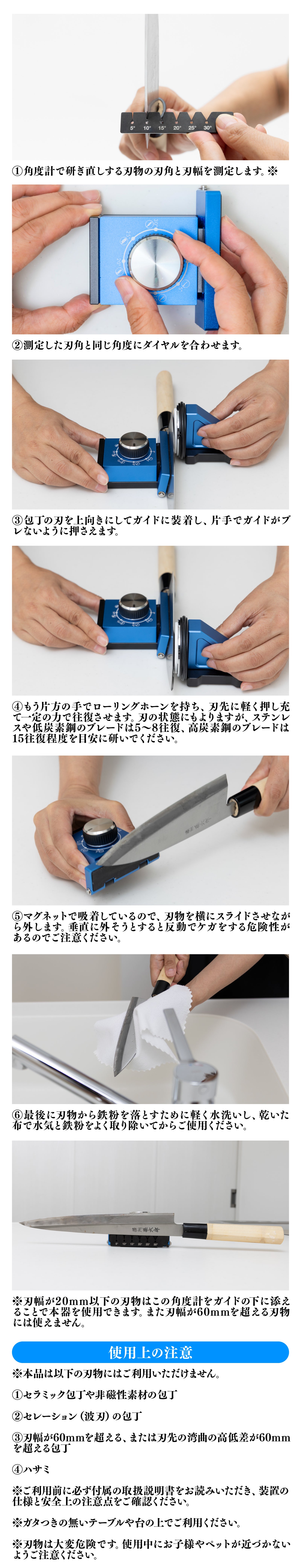 A はい、研げます。カミソリ、刺身包丁、台所包丁、アウトドアナイフ、中華包丁、鉈(ナタ)など、刃の角度5〜30度までの幅広い刃物に対応しています。
