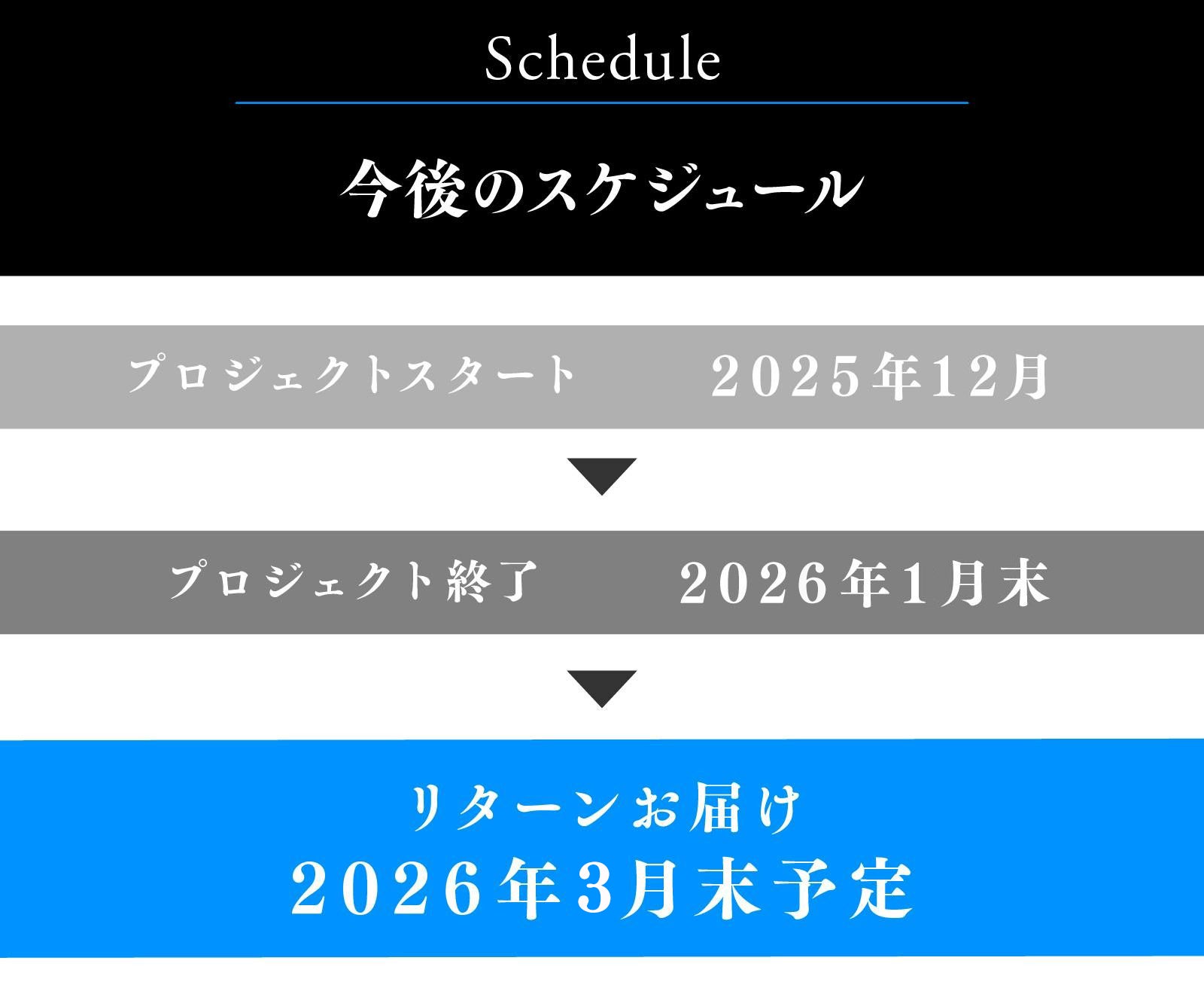 ●引渡し時期: 各リターン詳細に記載の発送予定月を引き渡し時期とします。但し、開発・生産状況によって遅れが生じる場合がありますのでその際は当プロジェクトページ内の「活動報告」または購入者へのメール等で連絡します。
