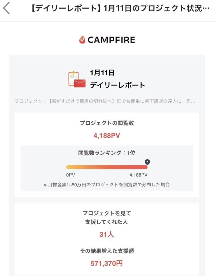 1/11の閲覧数4,188PVで、目標金額1~50万円のプロジェクト中第1位にランクインしました