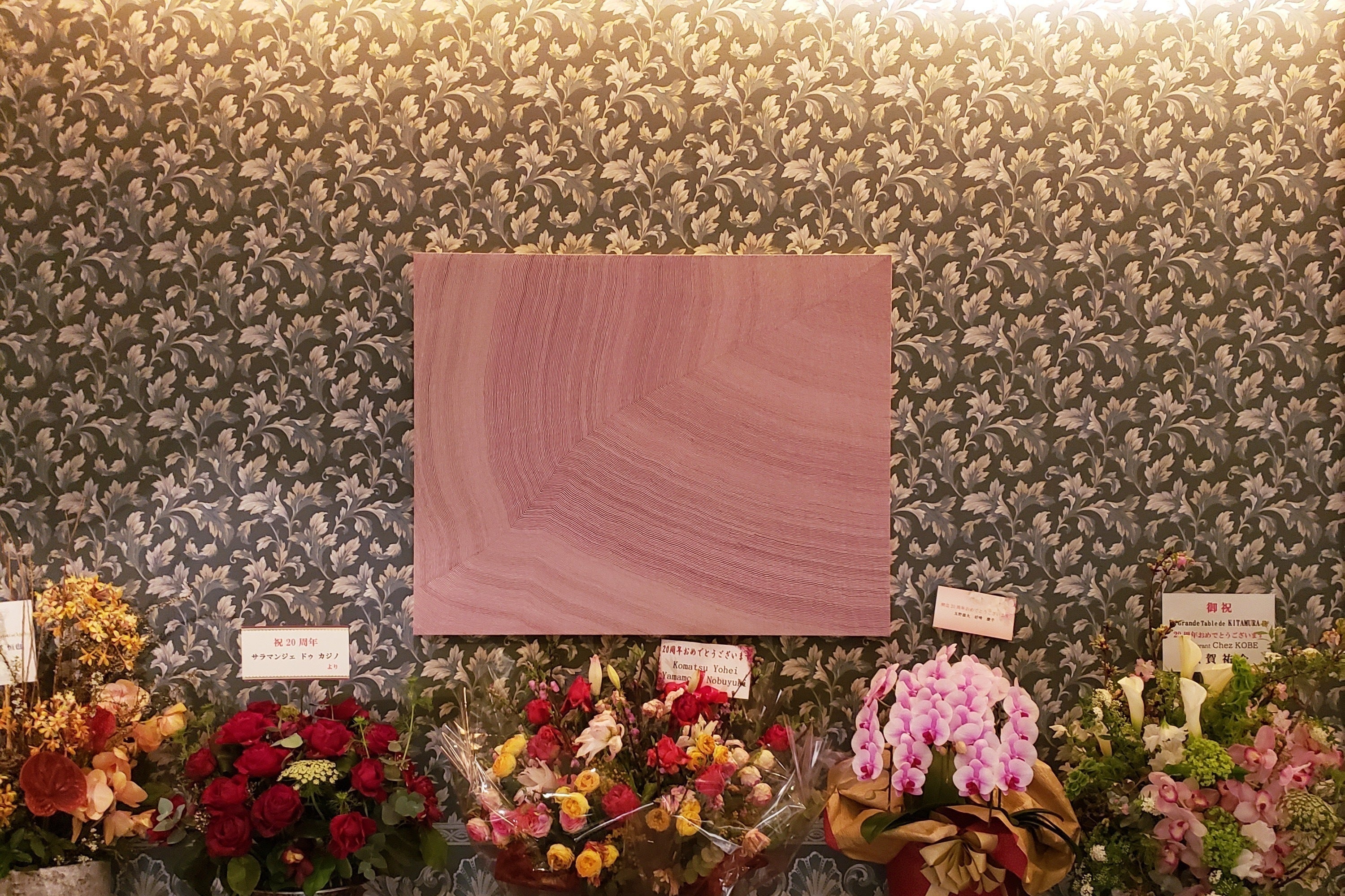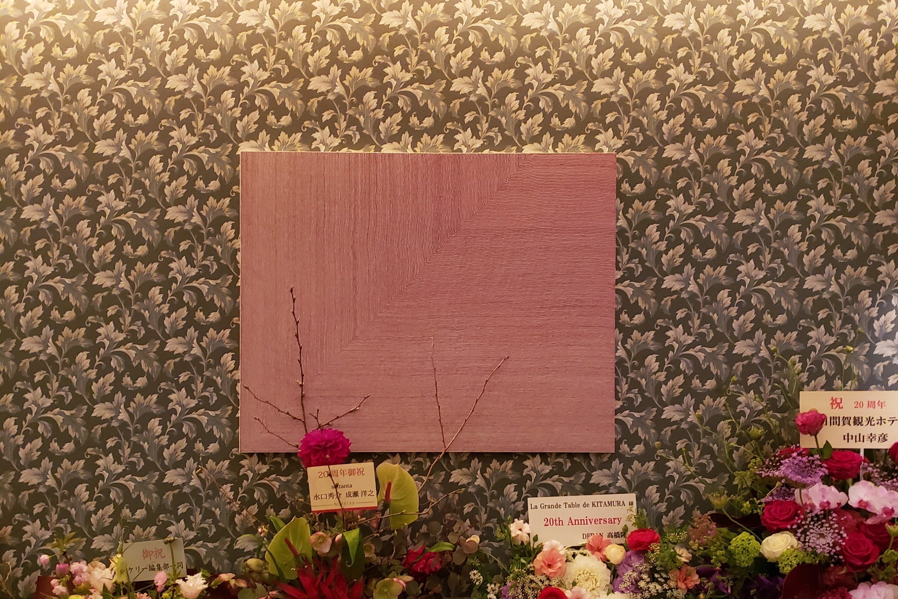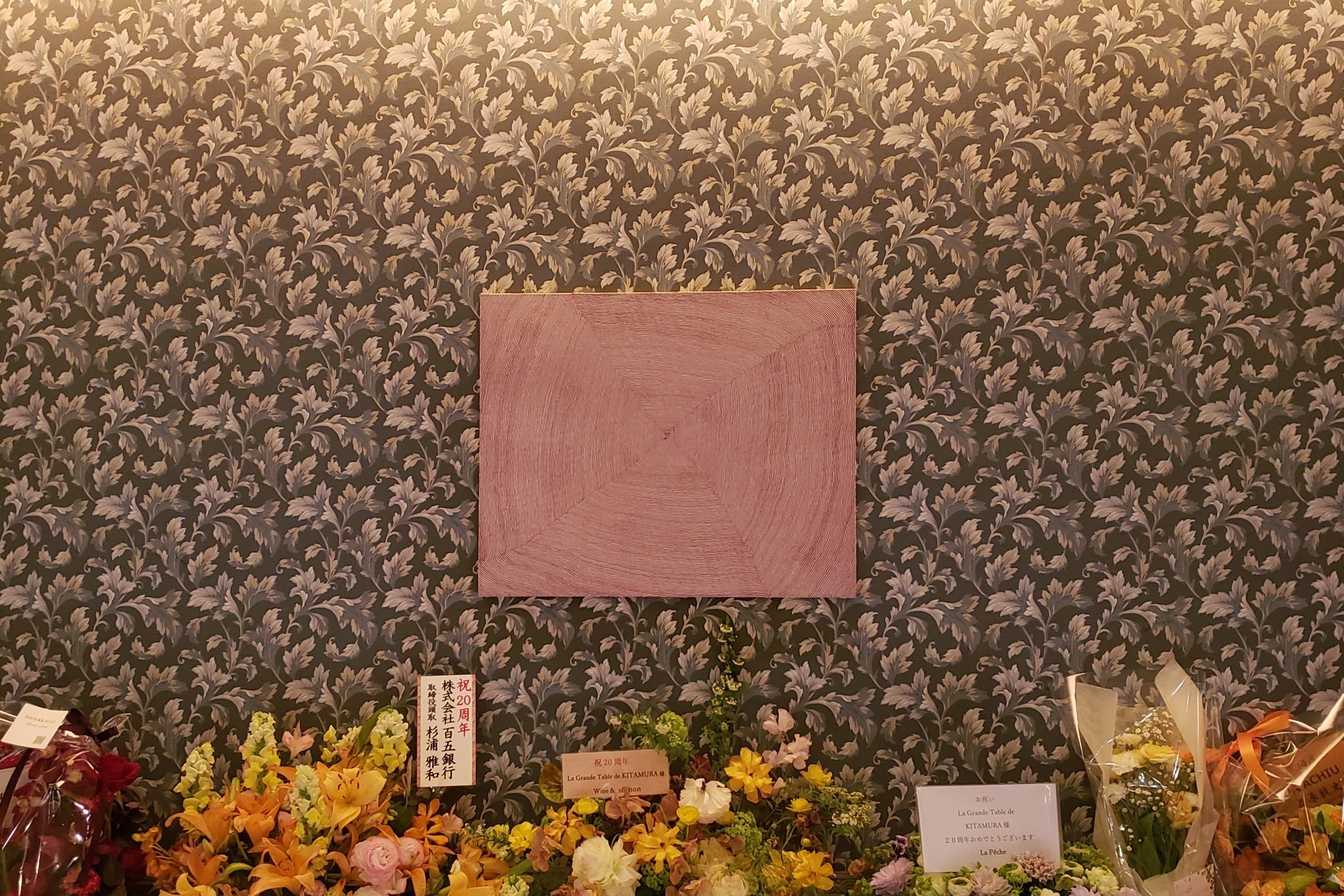 現在、名古屋市の高級フレンチレストラン「ラグランターブルドゥキタムラ」様にて、私が愛知県出身というご縁もありご厚意でホール3点・個室1点の計4点の作品を展示させて頂いております。