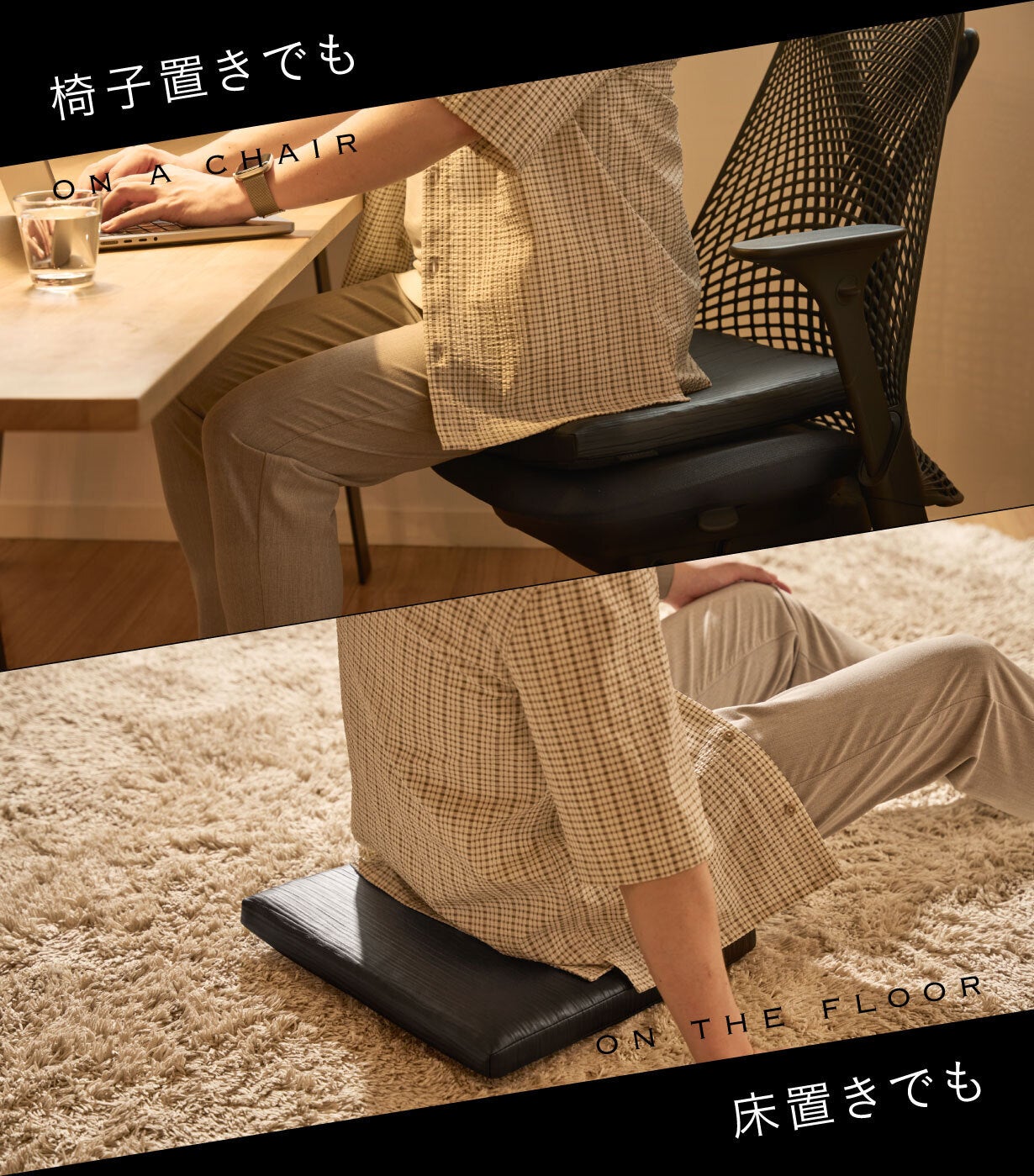 また、床置きでも椅子置きでも使用でき、慣れた座り心地をいつでもどこでもストレスなく手に入れることができます。