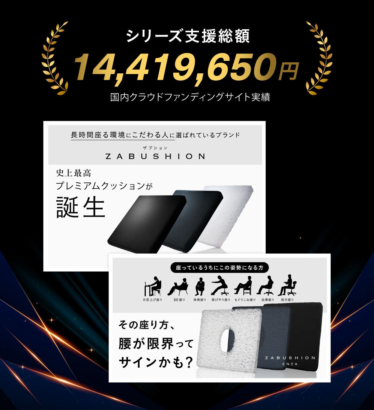 「日々の長い座る時間をもっと楽しく快適にし、同じ悩みを持つ人を助けたい」と考え、開発に至ったのが、正しい姿勢を保つための体圧分散性・通気性を極めたクッション「ZABUSHION(ザブション)」でした。