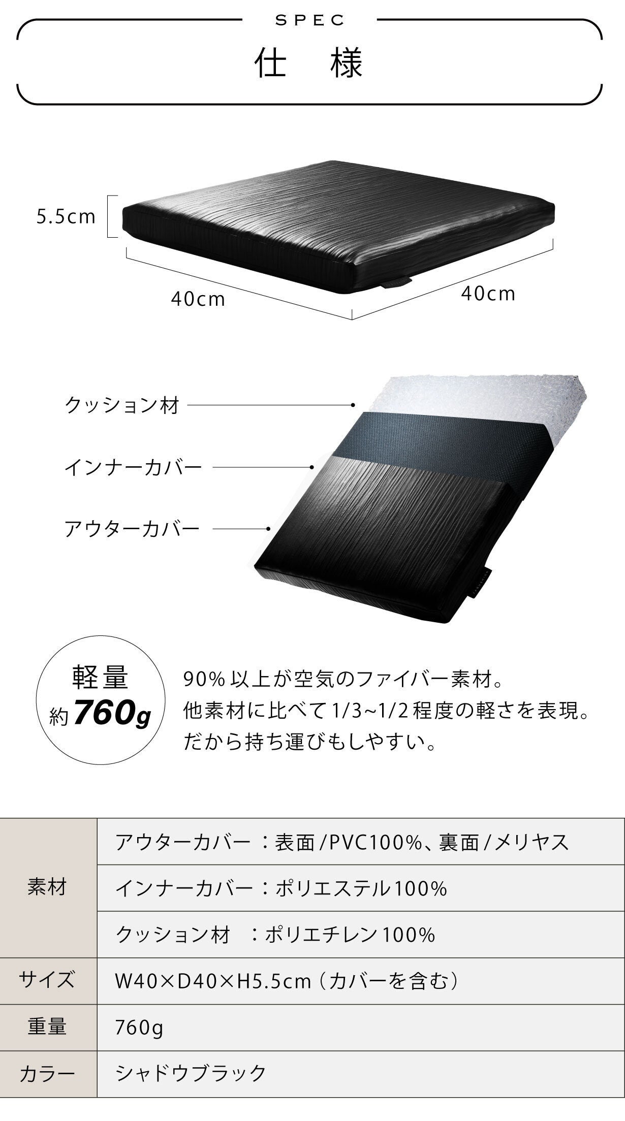 お尻をしっかりホールドし、さまざまなシーンにフィットする理想の大きさを追求した約40cm四方のスクエアクッションです。