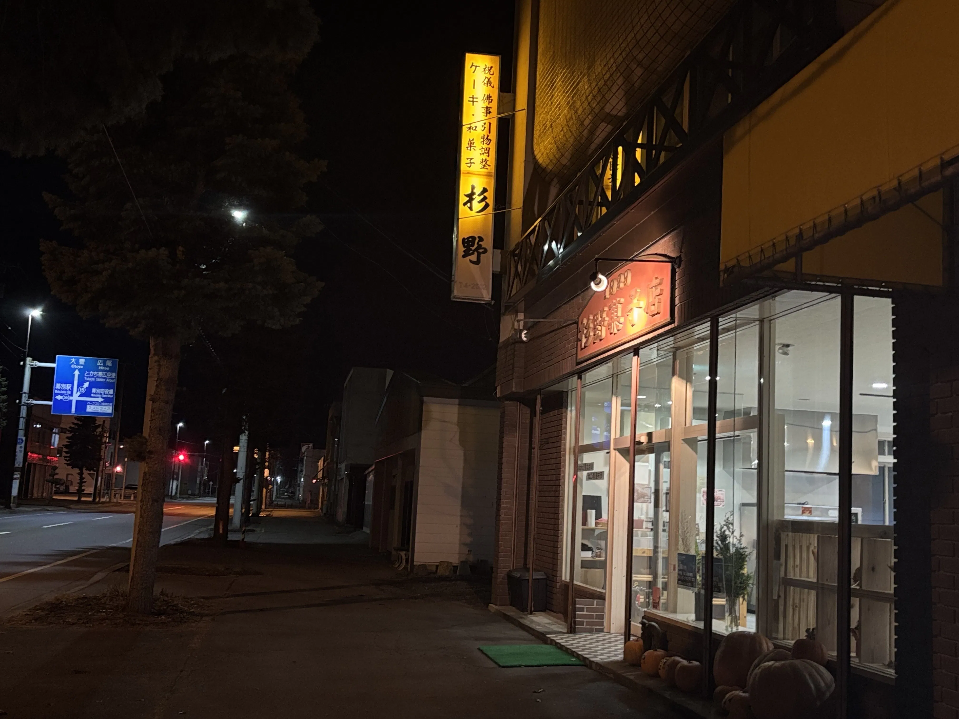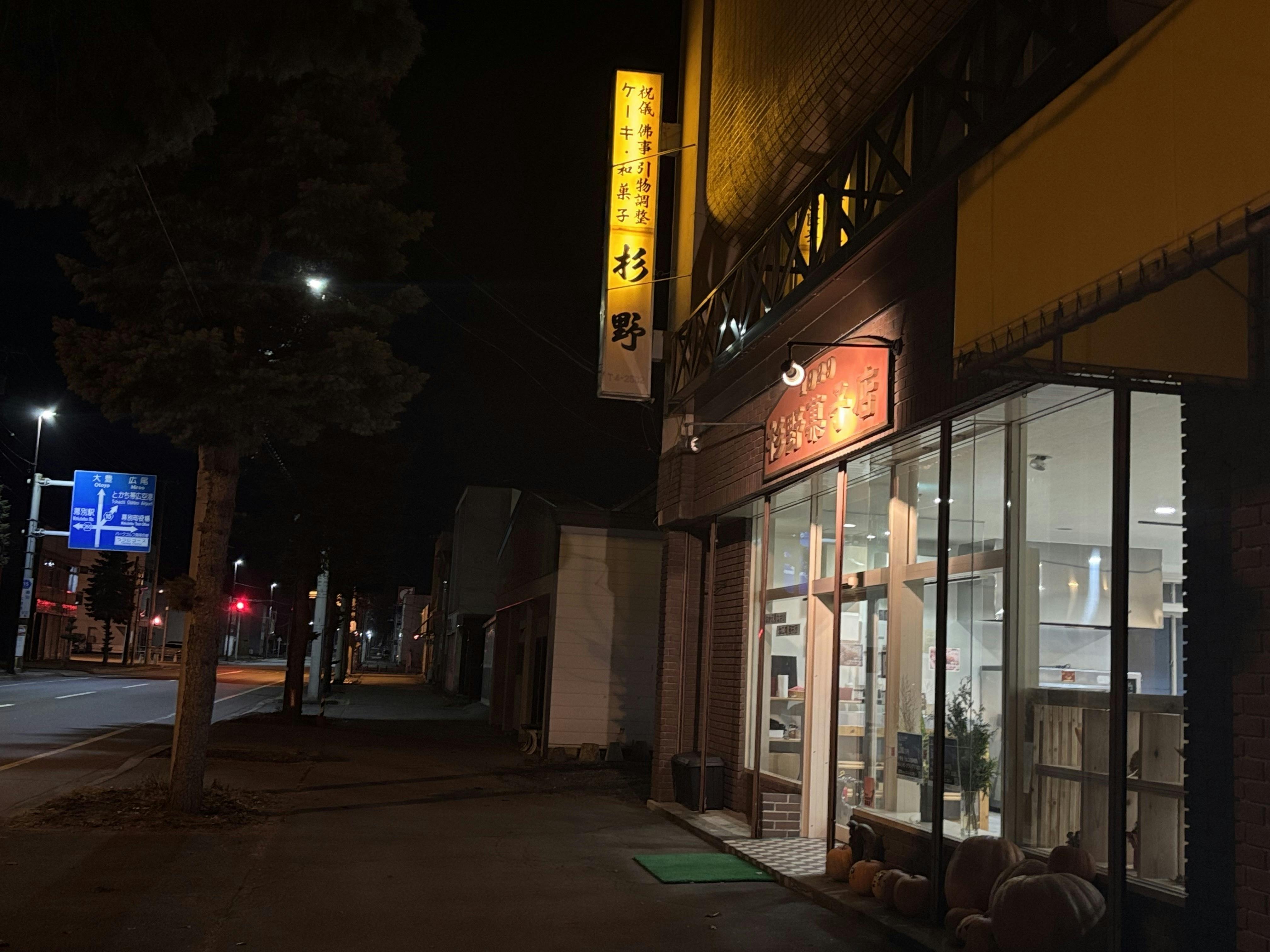 北海道の幕別町の商店街のど真ん中にある旧杉野菓子店の夜の風景は寂しいです。灯りをつけて営業をやっている商店が本当に少ないです。