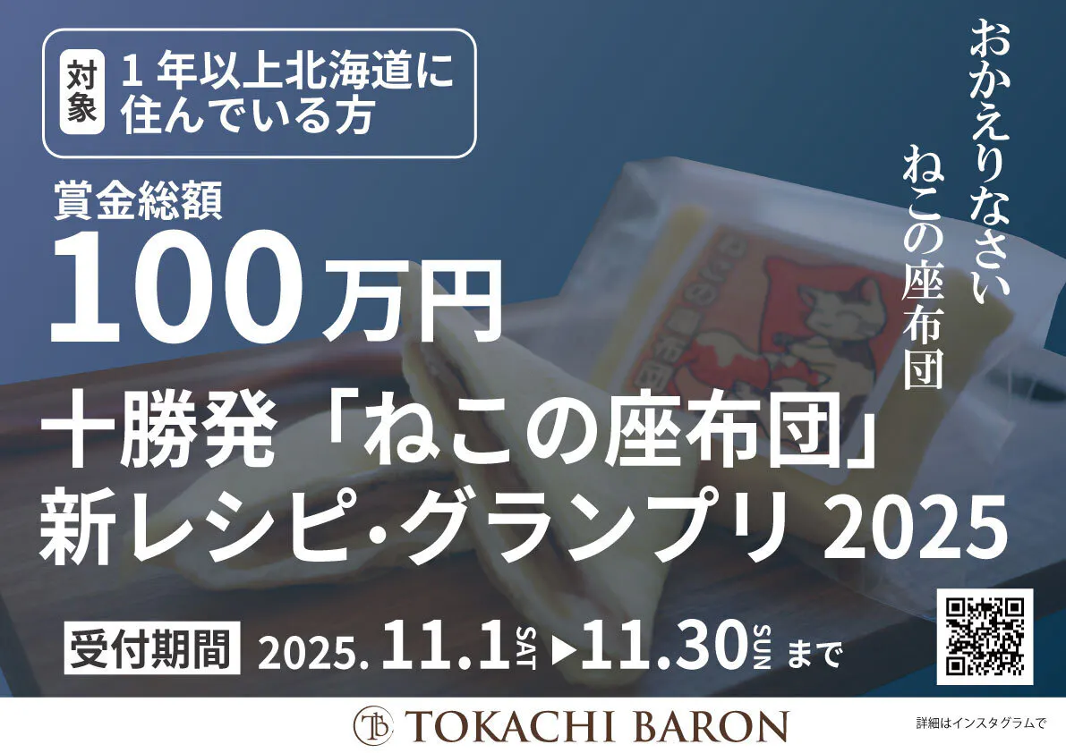 「十勝発『ねこの座布団』新レシピ・グランプリ2025」をスタートしました。総額100万円の賞金を設定し、入賞作品は商品化を前提に検討。一次審査は弊社の専門家グループ、最終審査は公式審査員100名によるホームユーステストで、“本当に選ばれる味”を決定します。