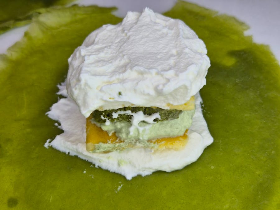 この「重ねる」工程は、・素材同士がなじむタイミング・冷凍・解凍後も美味しさを保つ構成・見た目の安定感を確認しながら行う、ねこの座布団づくりの要となる作業です。