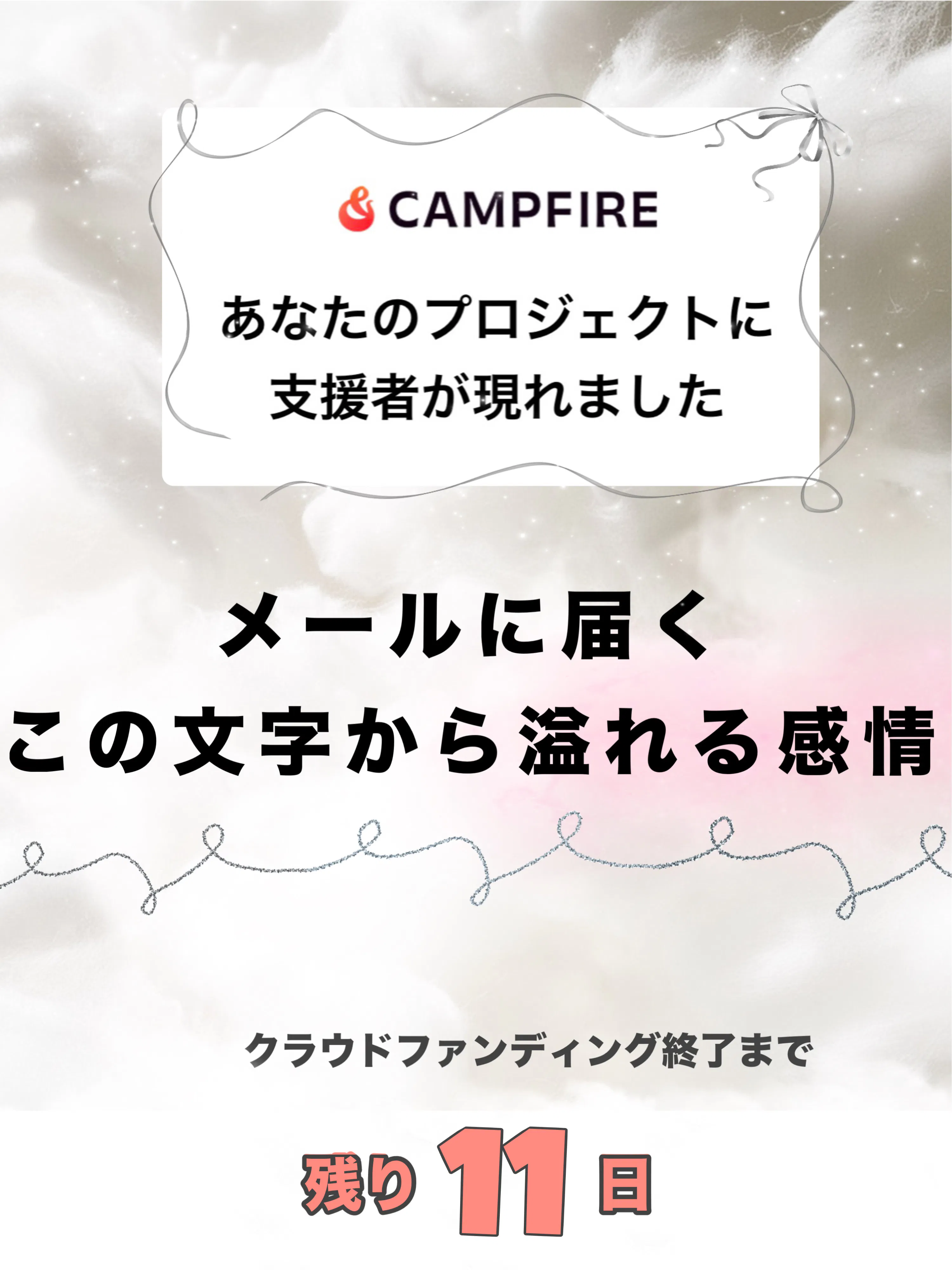 こんにちは!nicoです(^^)皆様のご支援、拡散等のご協力をいただき、現在32万円を突破いたしました。本当にありがとうございます。クラウドファンディングのご支援をいただいた際、私にはメールが届くんです。画像のように。私は、誰からと確認する前から、グッと込み上げる想いがあります。1番は「伝わってくれた」という想いです。精神疾患は目に見えない病。理解されにくい病。人によっては、「元気じゃん!」「全然大丈夫そう!」「いつもと変わらない!」「もう働けるでしょ!」と思う方もいらっしゃると思います。ですが、その裏には突然動かなくなる体、呼吸ができず苦しむこと、泣き続ける日。まだまだなんです。これが現実。だからこそ、これらが理解されたと実感する瞬間、金額関係なく、応援してくださっているという事実。コメントからご支援者様の想いも受け取り、少しずつではありますが、前に進んでいます。そして、残り11日。ここからがラストスパートです!皆様のお力をもう一度お借りしたいです。SNSでの拡散、知人への共有等、なんでも構いません。一緒にこれから良いスタートを切るために、どうかよろしくお願いいたします。