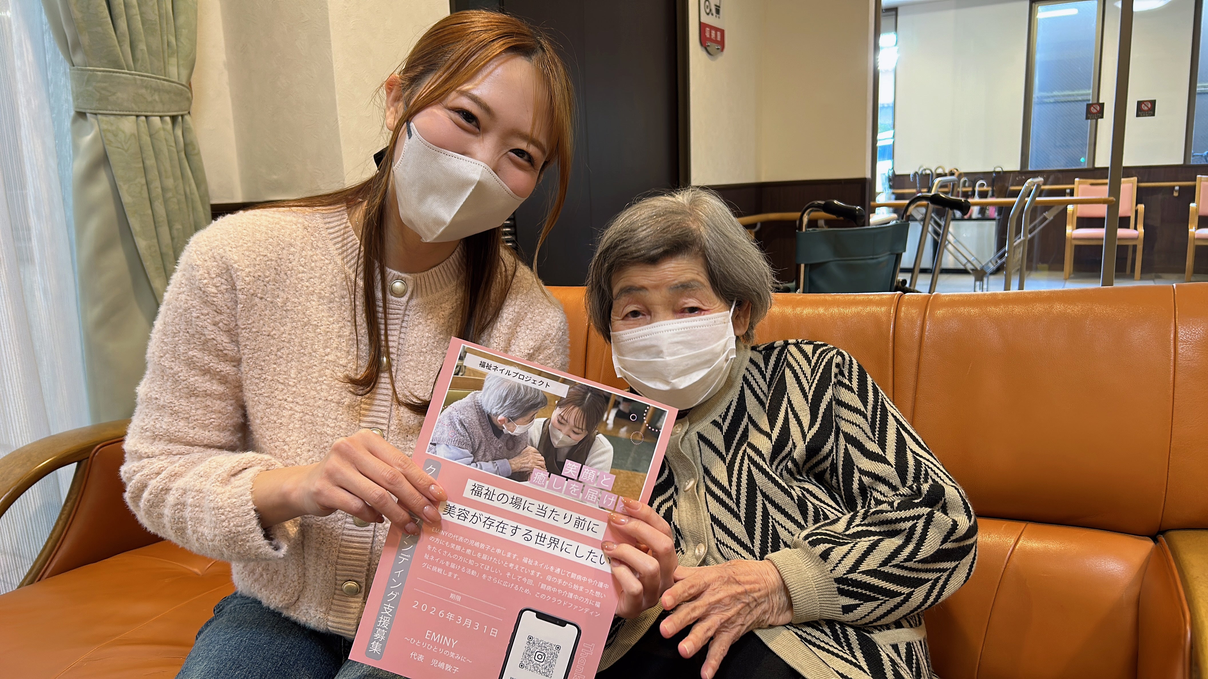 クラウドファンディングのページやチラシにご協力いただいているおばあちゃんがいるリーフ新市さんへ、お礼のご挨拶に伺いました。そのおばあちゃんは、施設の主任・瀬尾さんのおばあちゃんです。久しぶりにお会いすると、前回のネイルのことを覚えていてくださいました。瀬尾さんからは、「ネイルのあと、とても気に入って、ずっと手を見て喜んでいたんです」と教えていただきました。何度も自分の手を見つめていたと聞き、指先から生まれる笑顔の力を、改めて感じました。福祉ネイルを、もっと多くの方へ届けたい。そう強く思えた一日でした。クラウドファンディングも応援してくださり、本当にありがとうございます。お会いできて、本当によかったです。また会いにいきます。