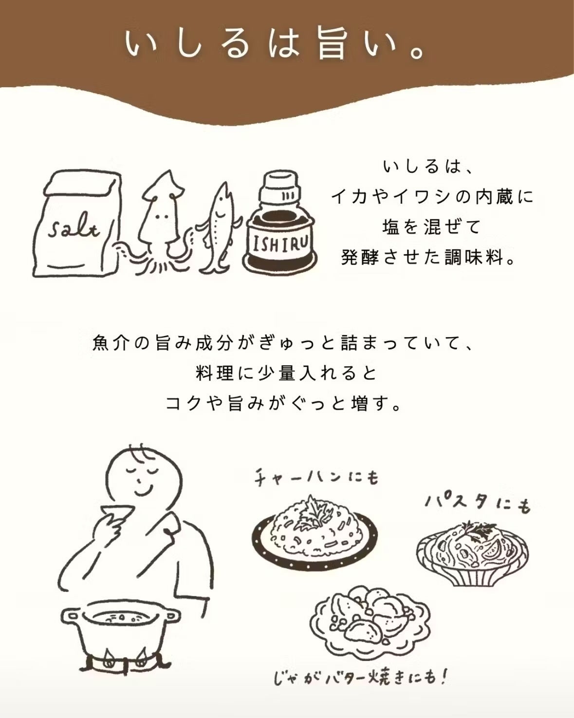 内臓を含むイカ(又はイワシ)と塩を加え、じっくりと1年以上かけて発酵・熟成させた天然の無添加旨味調味料。