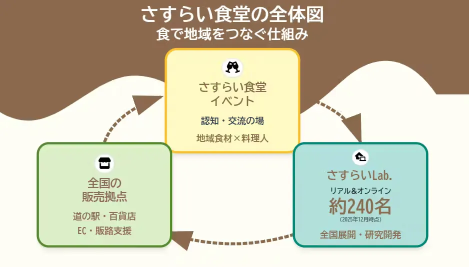 現在、さすらい食堂の仲間ともに「食×旅」をキーワードに食材や食文化、生産者の方々など、地域を探訪する、研究する、楽しむことに興味がある人達とともに「SASURAI LAB.」というグループをつくり、全国に250名を超えるの料理人や生産者が集まるコミュニティに発展しています。