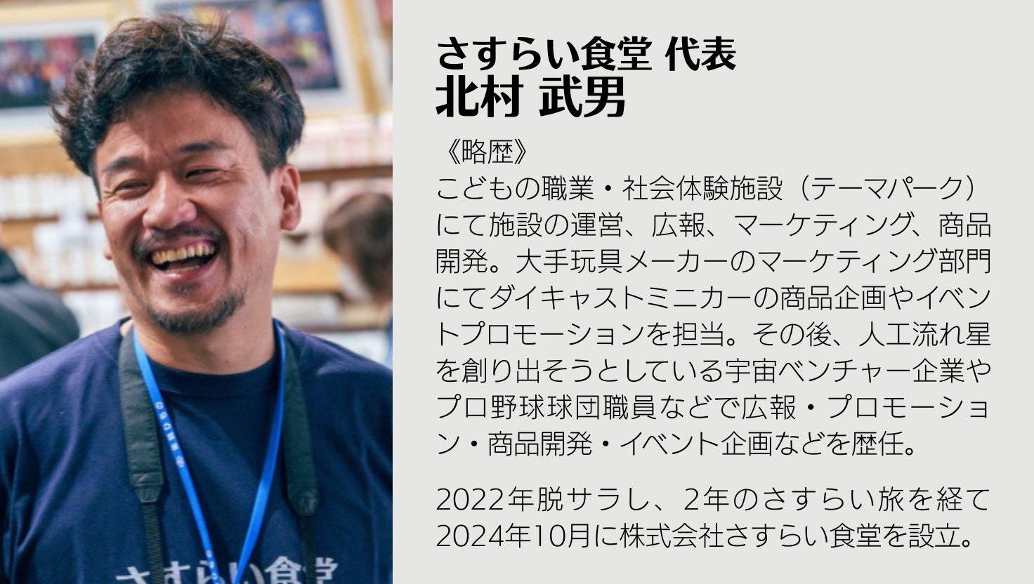 全国をさすらいながら、「食×旅」をキーワードにそれぞれの地域を愉しむ場づくりをしている、さすらい食堂の北村武男です。
