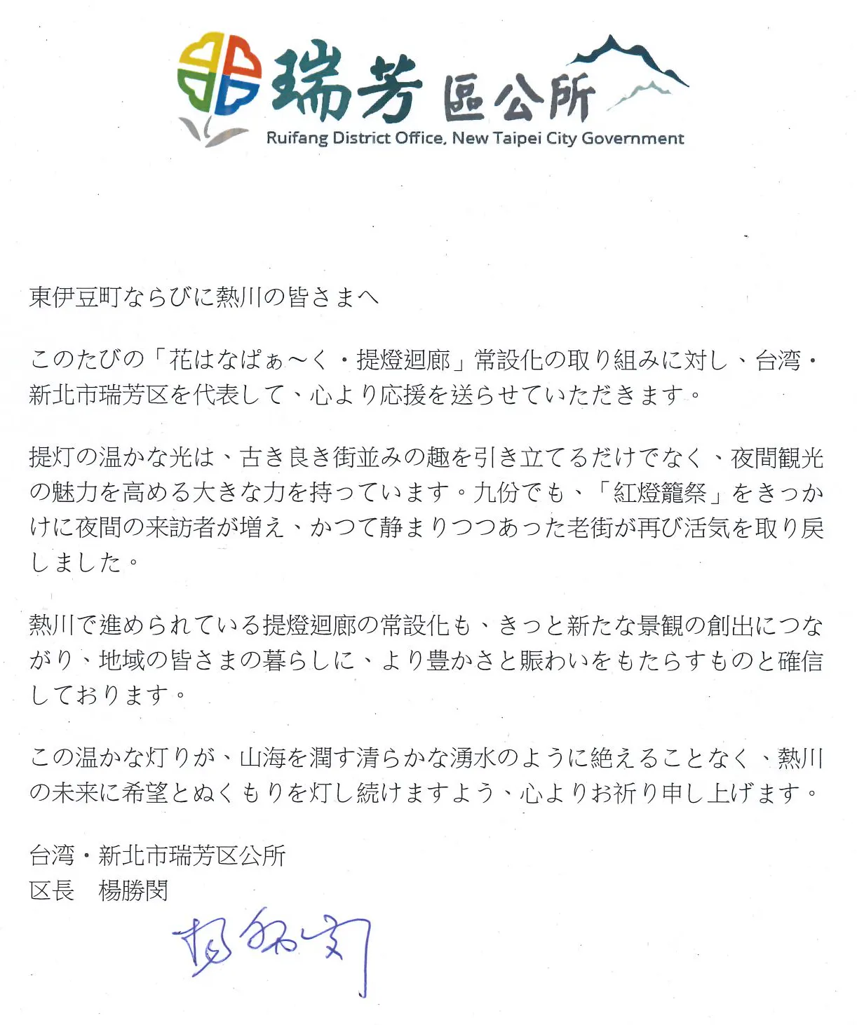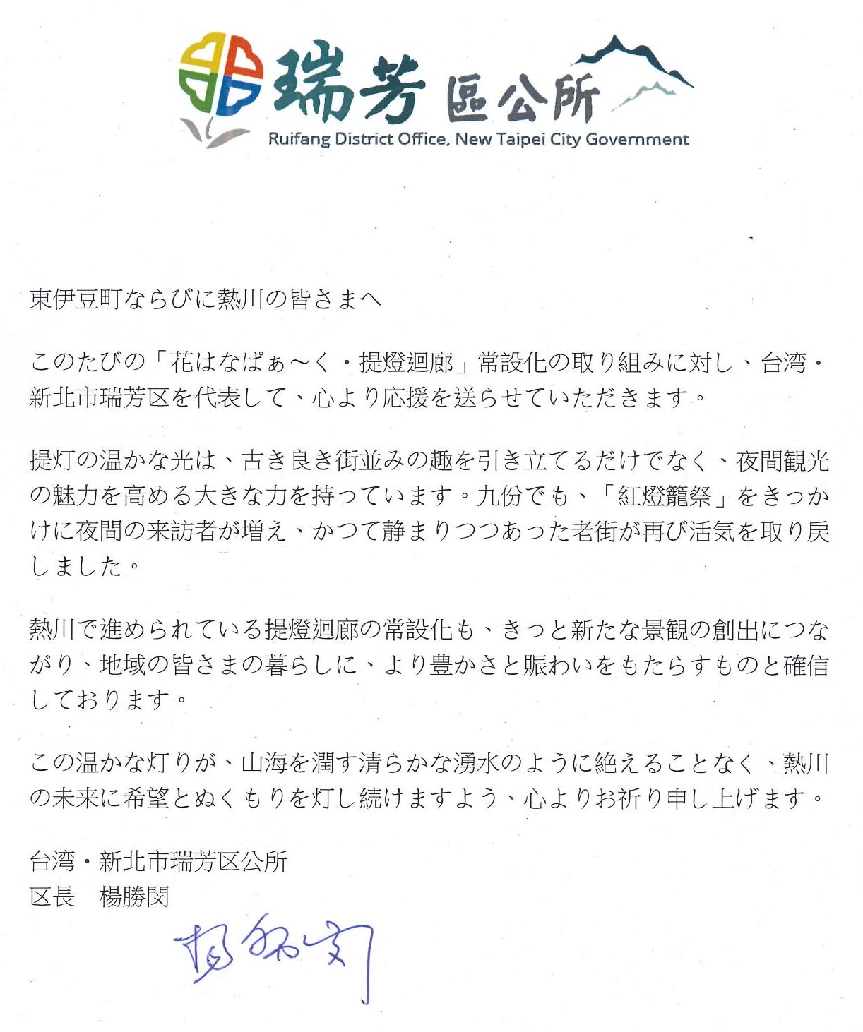 ■台湾・新北市瑞芳区公所 区長 楊勝閔 様