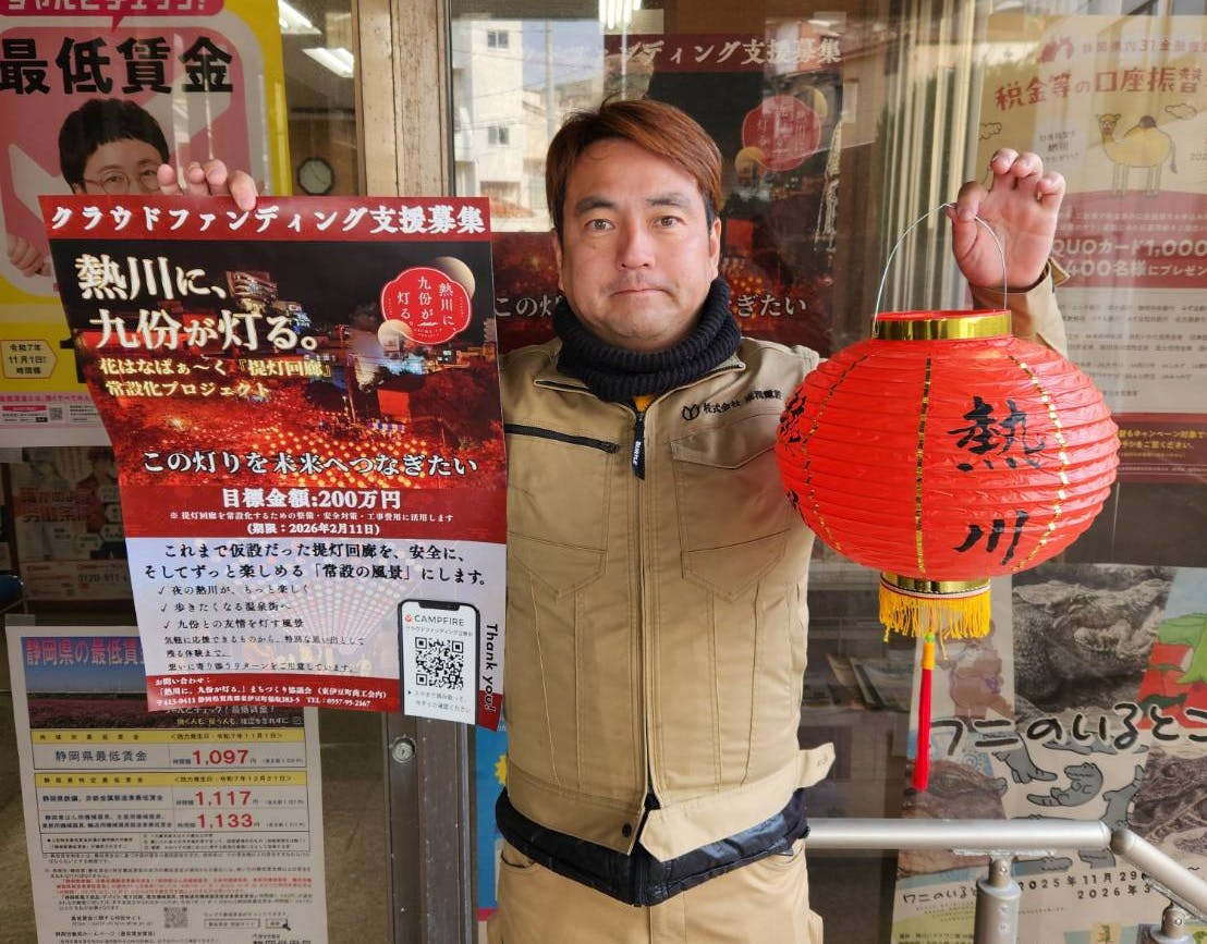 2026/01/12 16:11「熱川に、九份が灯る。まちづくり協議会」のメンバーであり、商工会副会長として地域に関わる 米澤さん から、本プロジェクトに向けた応援メッセージをお寄せいただきました。熱川のこれまでと、これから先の子どもたちへ続く未来を見据えて綴られたメッセージです。地域の一員としての率直な思いが込められています。以下、米澤さんからのメッセージをご紹介します。――――――――――かつて浴衣姿のお客様でにぎわっていた熱川温泉も、時代の流れの中で、活気を失った時期がありました。通りに人影が少なくなり、寂しさを感じることもありました。そんな中、町の方々がつないでくれた台湾とのご縁によって、今、熱川の温泉場には真っ赤な台湾提灯の灯りがともっています。点灯式の日、通りにあふれた人の姿を見て、久しぶりに胸が熱くなりました。この光景を、これからも子どもたちに見せていきたい。熱川に、再びあたたかなにぎわいを取り戻すため、地域の仲間たちと力を合わせ、この挑戦に取り組んでいきます。――――――――――一人ひとりの思いが重なり、少しずつ、まちの風景が変わり始めています。この挑戦を、多くの方と共有しながら、これからも丁寧に積み重ねていきたいと考えています。 もっと見る