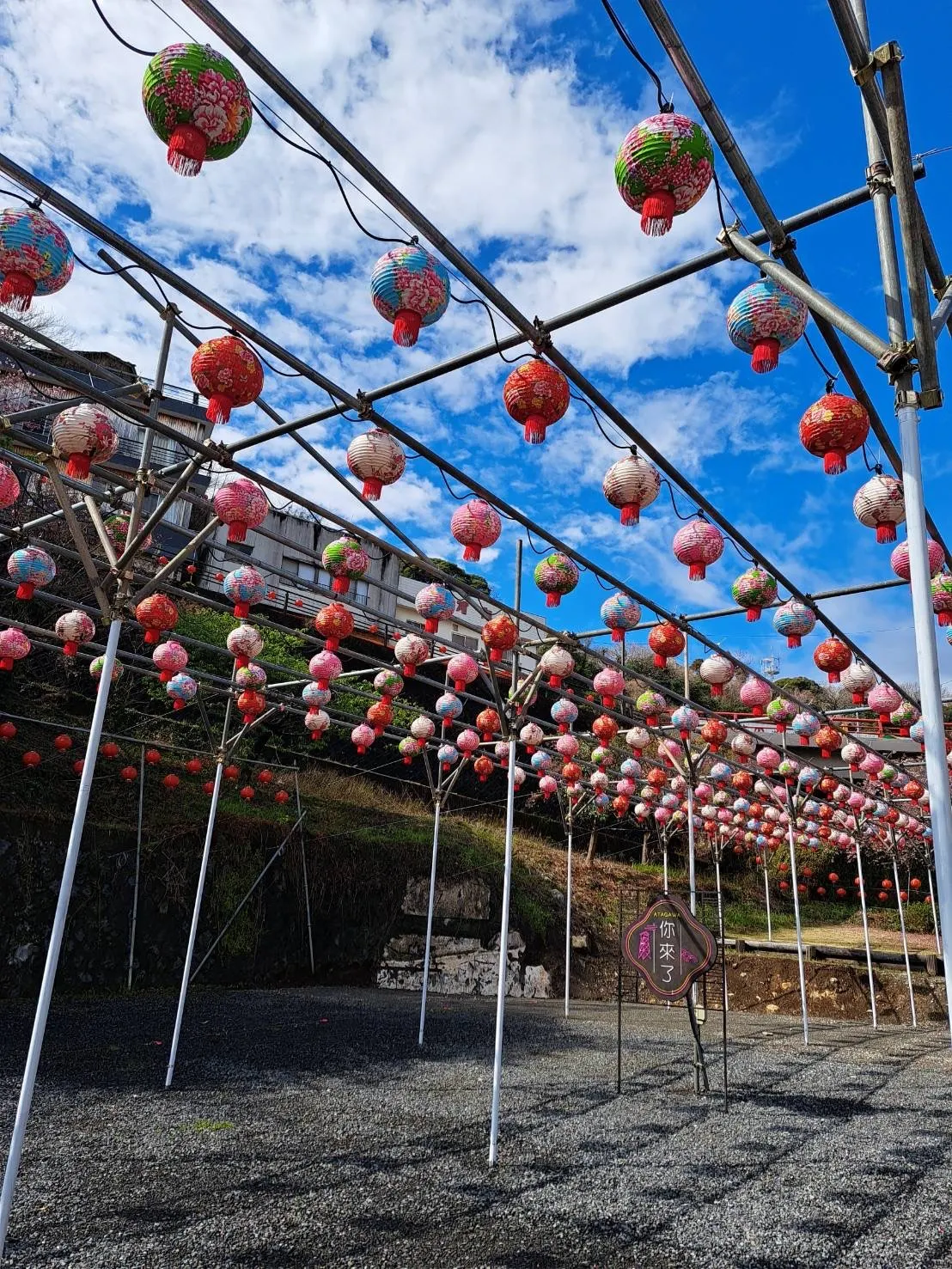 設置した回廊に、より多くの提灯が連なり、