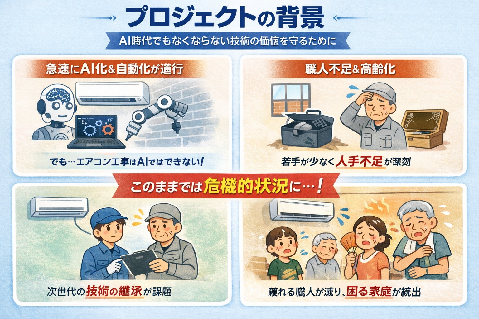 一方で、現場の高齢化、人手不足、若手の流入減少によって、生活インフラである空調工事の担い手が減少しています。