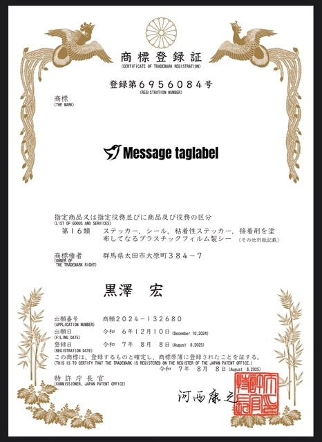 メッセージタグラベルは、まだまだ知名度が低く目にすることがあまりないと思います。それが故にチャンスなんだと考えています。この価値に気づいてくれる人が少ないままでは市場に広がりません。あえて特許も現在は取っていません。拡めるめることが優先と考えているからです。ビジネスモデルも各業界で構築できるのではないかと考えています。このクラウドファンディングは「製品を売るため」と言うよりは “世の中に、皆様に知ってもらうための第一歩” と考えています。個人でも、もちろん企業様でも、少しでも「面白い」「使える」と感じていただけたら、ご支援、応援していただけたらありがたいです。本当に力になります。この【メッセージタグラベル】を 何卒よろしくお願いいたします。