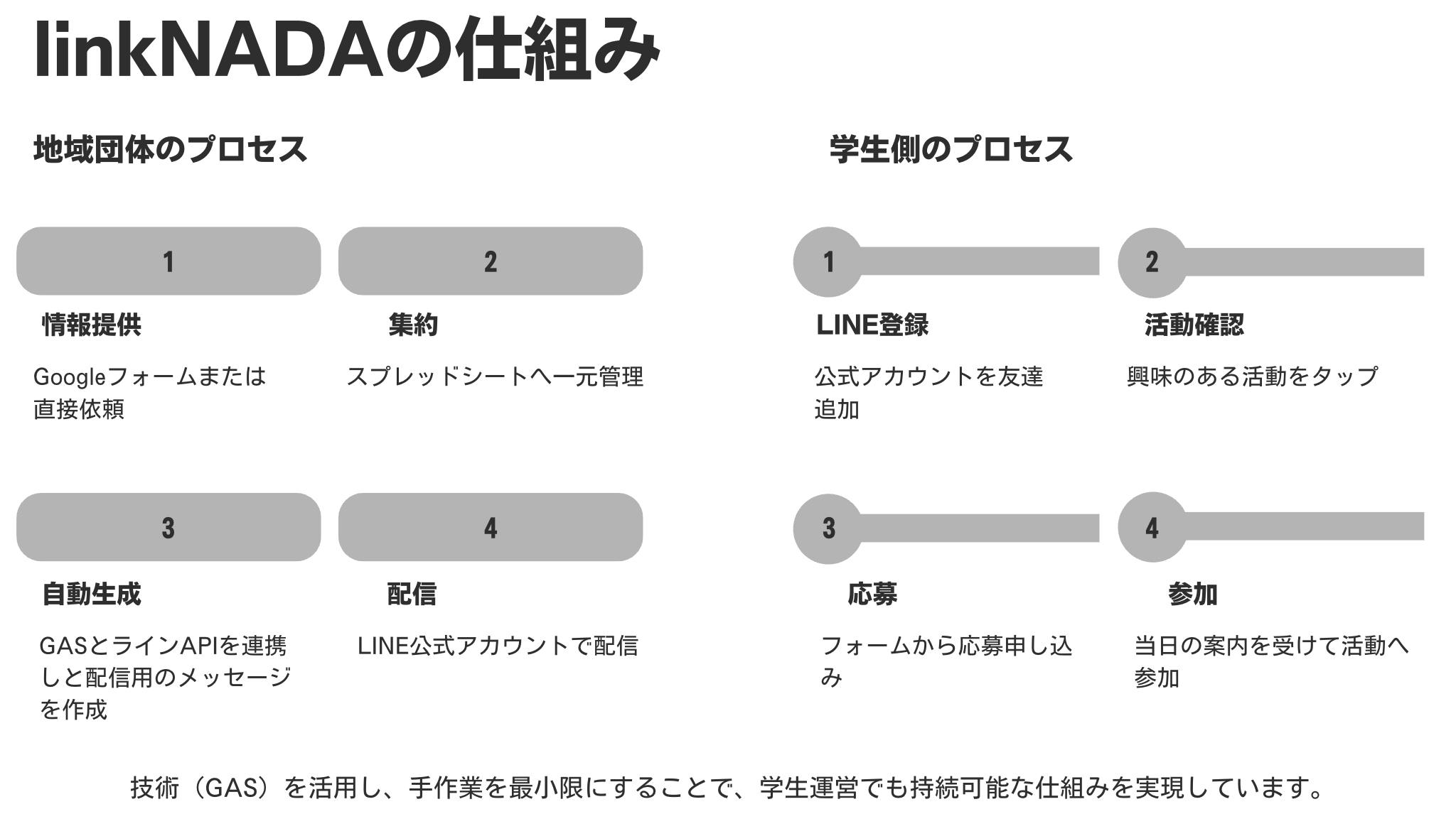 それなら、地域に出たい「学生自身」が、簡単に地域の情報を知れる仕組みをつくればいい。(どうすれば自分達が便利に参加できるか知っているから)