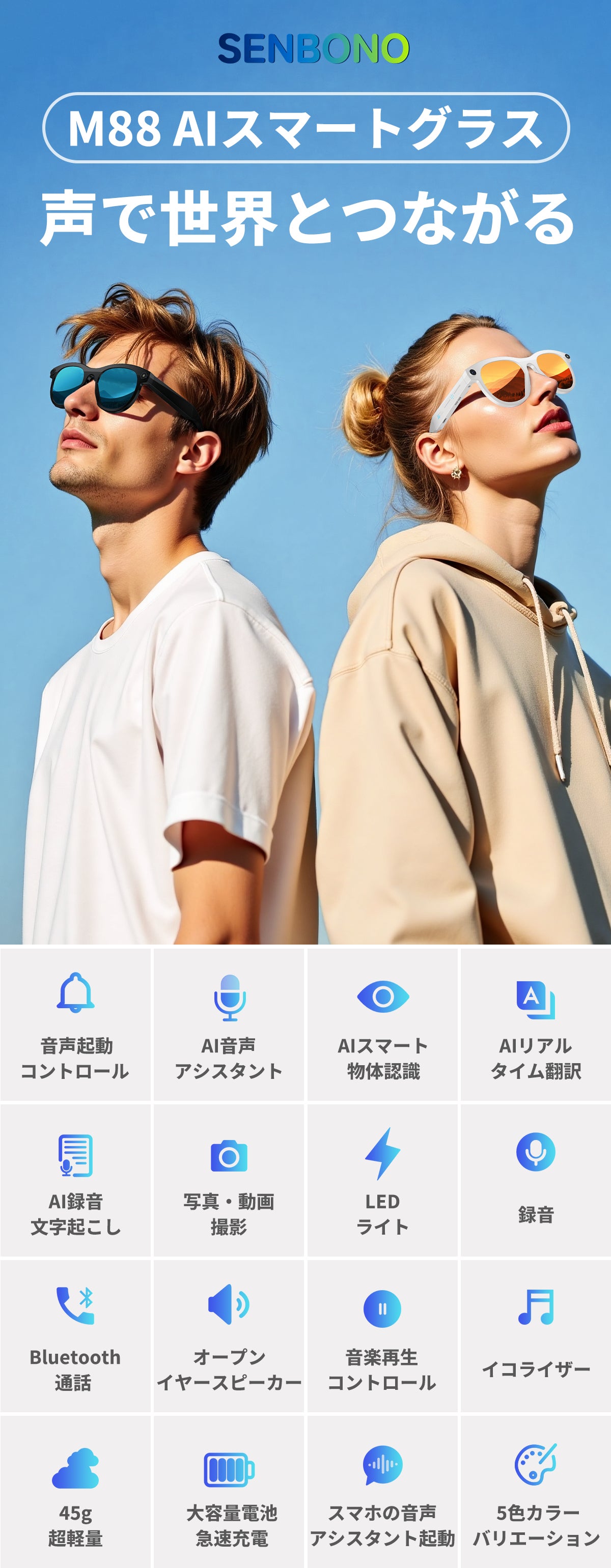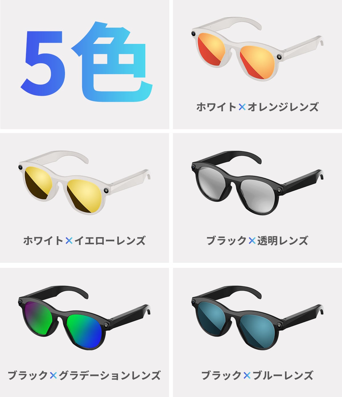シーンや服装に合わせて選べる5色を展開。洗練されたホワイト、スタイリッシュなブラックに加え、レンズカラーで個性を演出します。毎日のファッションをより楽しく、よりスマートに彩ります。