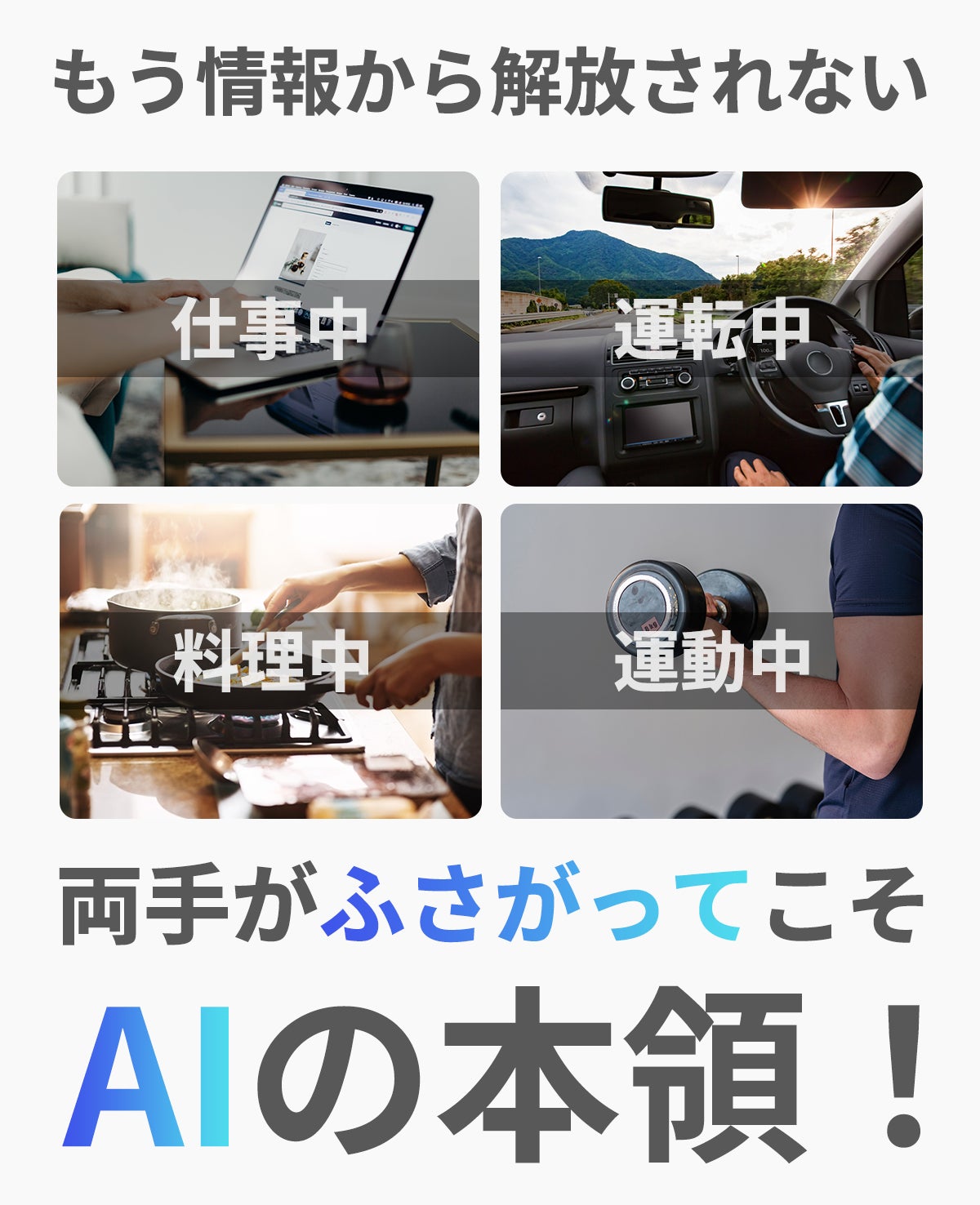 音楽再生や写真撮影まで、両手が塞がった状態でも声だけで自在に操作可能。スマートフォンを取り出す手間を省き、料理中や運転中など、あらゆるシーンで効率的な生活をサポートします。